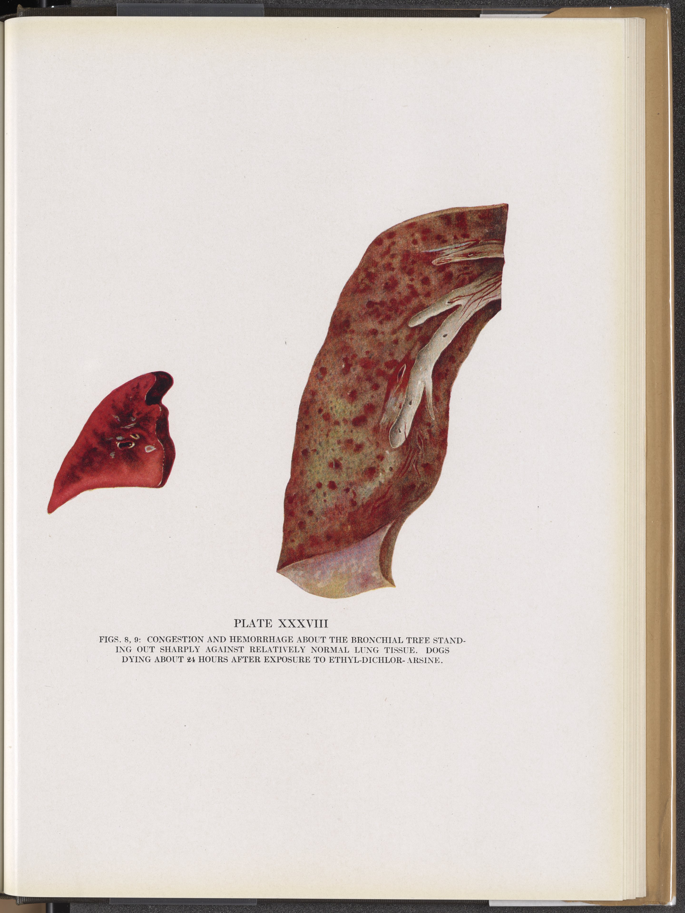 Winternitz, M. C. (Milton C.). “Plate XXXVIII (Figs. 8, 9): Congestion and Hemorrhage about the Bronchial Tree Standing out Sharply against Relatively Normal Lung Tissue.” Collected Studies on the Pathology of War Gas Poisoning. New Haven, Connecticut: Yale University Press, 1920. https://digital.sciencehistory.org/works/5d86p043w.
