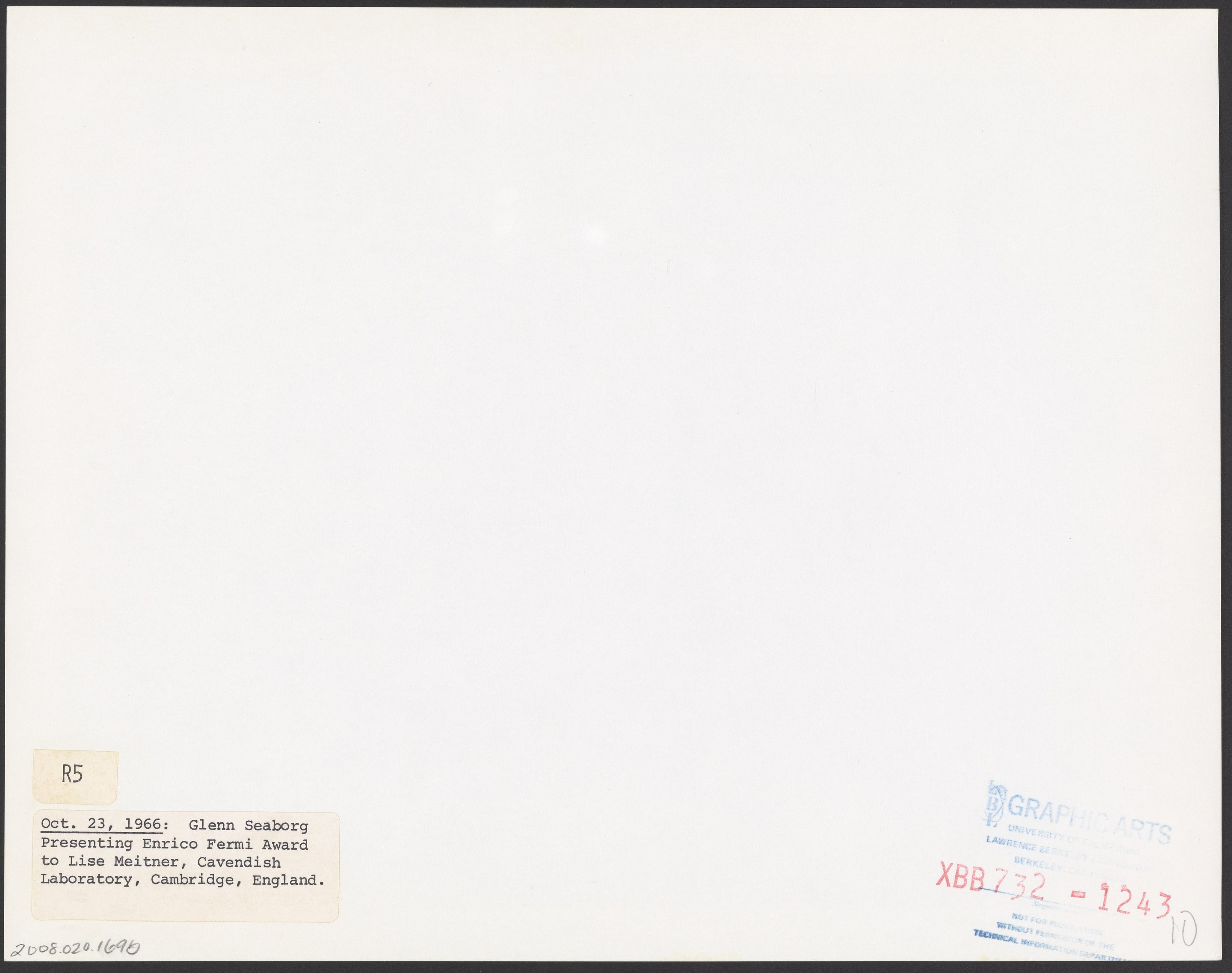 Small JPG1200 x 943px — 150 KBLarge JPG2880 x 2264px — 769 KBFull-sized JPG6844 x 5380px — 3.8 MBOriginal fileTIFF — 6844 x 5380px — 105 MBBlack and white photo depicting Glenn Seaborg (1912-1999) presenting the Enrico Fermi award to Lise Meitner (1878-1968) at the Cavendish Laboratory in Cambridge, England. Meitner was an Austrian-Swedish physicist who discovered the element protactinium as well as nuclear fission.
