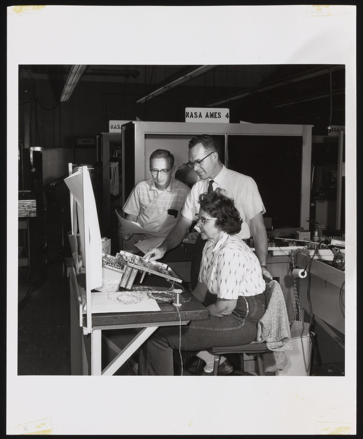 General view of several Beckman Instruments employees wiring a timing generator purchased by Convair Astronautics. The employees visible in the photograph are identified as follows (left to right): Pete Kappauf; Homer Palmer; and Mary Law.