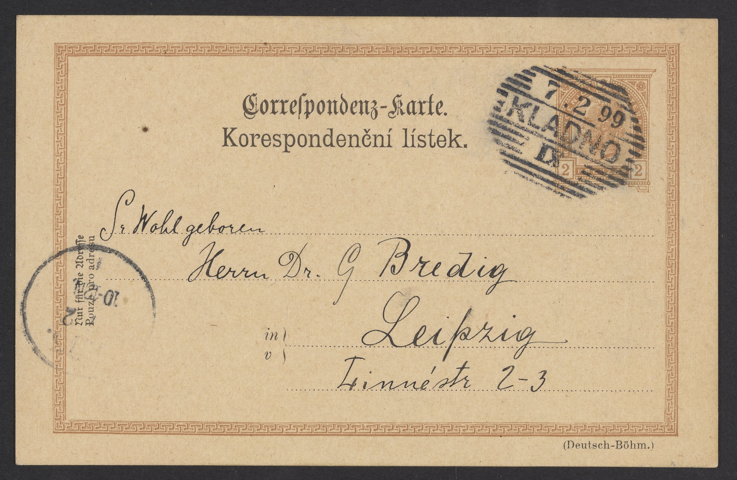 Wald, Frantisek. “Postcard from František Wald to Georg Bredig,” February 6, 1899. Papers of Georg and Max Bredig, Box 2, Folder 63. Science History Institute. Philadelphia. https://digital.sciencehistory.org/works/5f5irj4.