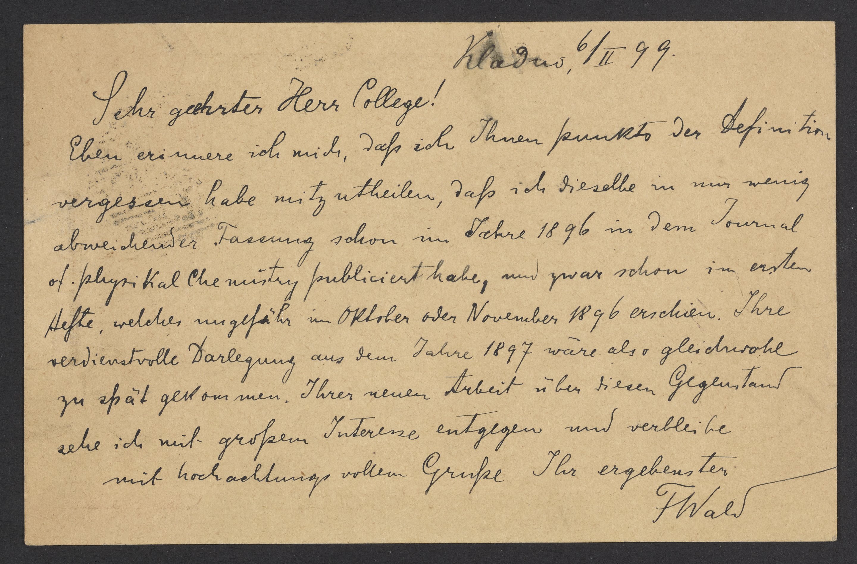 Eben erinnere ich mich, daß ich Ihnen punkto der Definition vergessen habe mitzutheilen, daß ich dieselbe in nur wenig abweichender Fassung schon im Jahre1896 in dem Journal of Physical Chemistry publiciert habe, nur zwar schon im ersten Hefte, welches ungefähr im Oktober oder November 1896 erschien. Ihre verdienstvolle Darlegung aus dem Jahre 1897 wäre also gleichwohl zu spät gekommen. Ihrer neuen Arbeit über diesen Gegenstand sehe ich mit grossem Interesse entgegen und verbleibe mit hochactungsvollem Grusse Ihr ergebenster F. Wald.