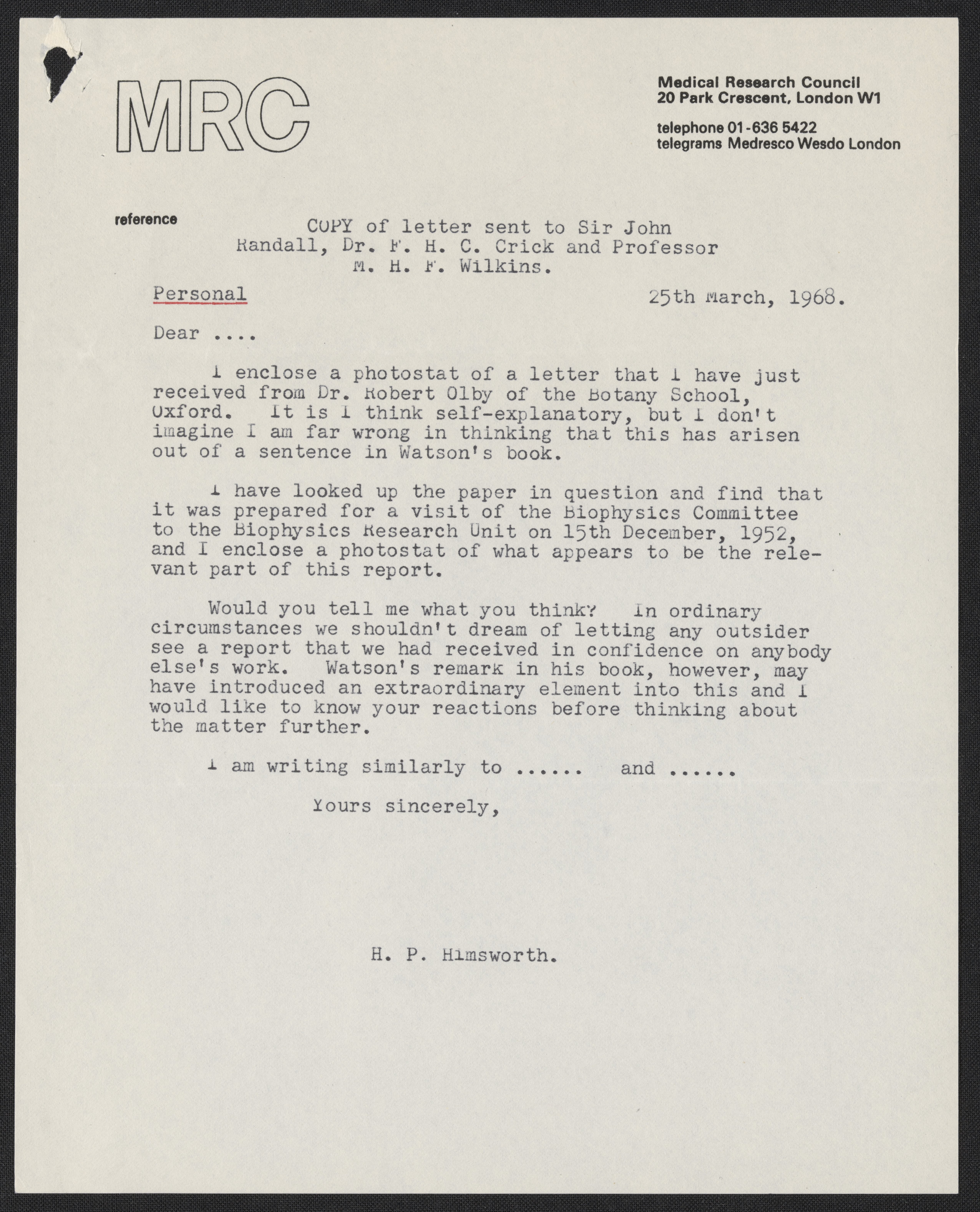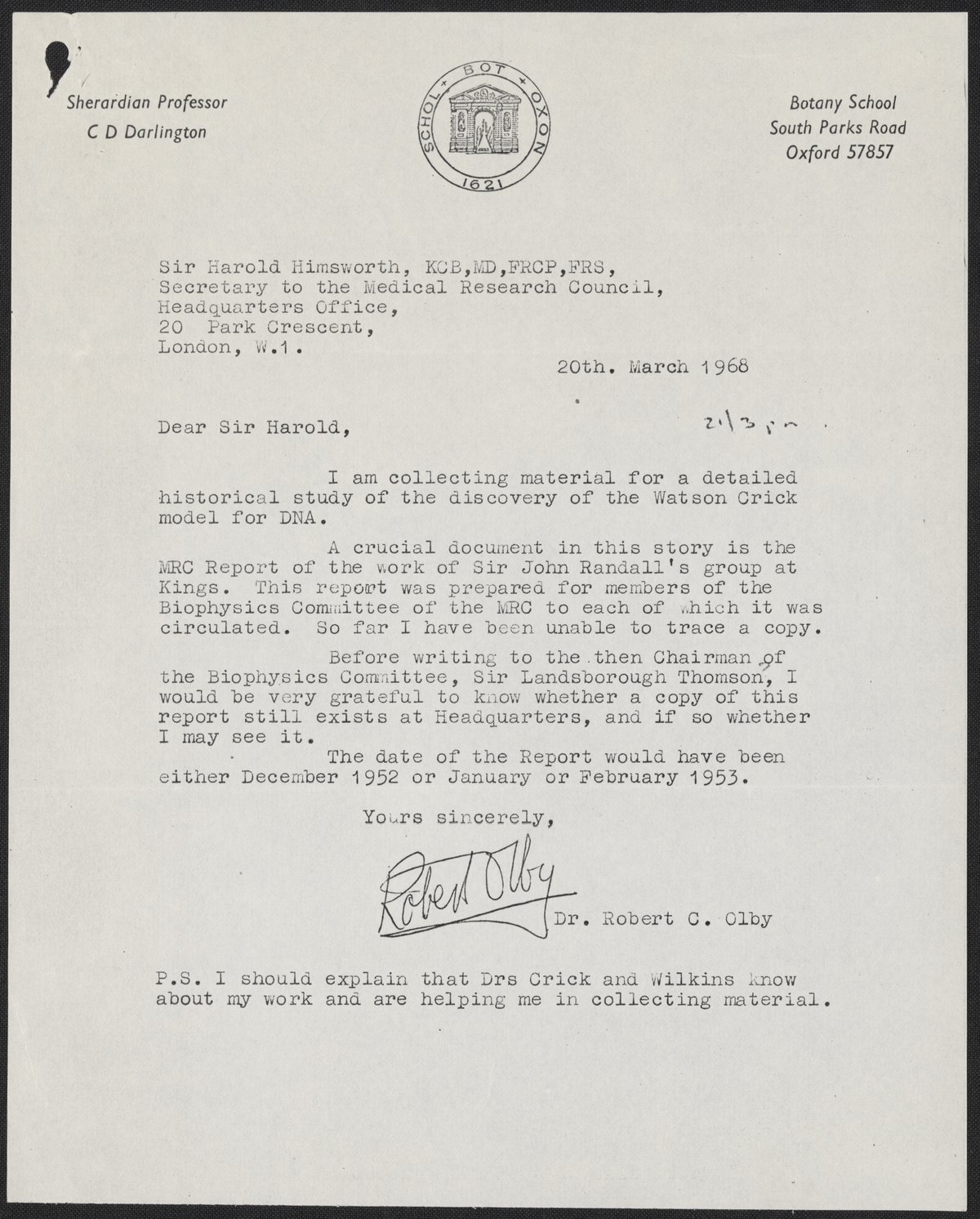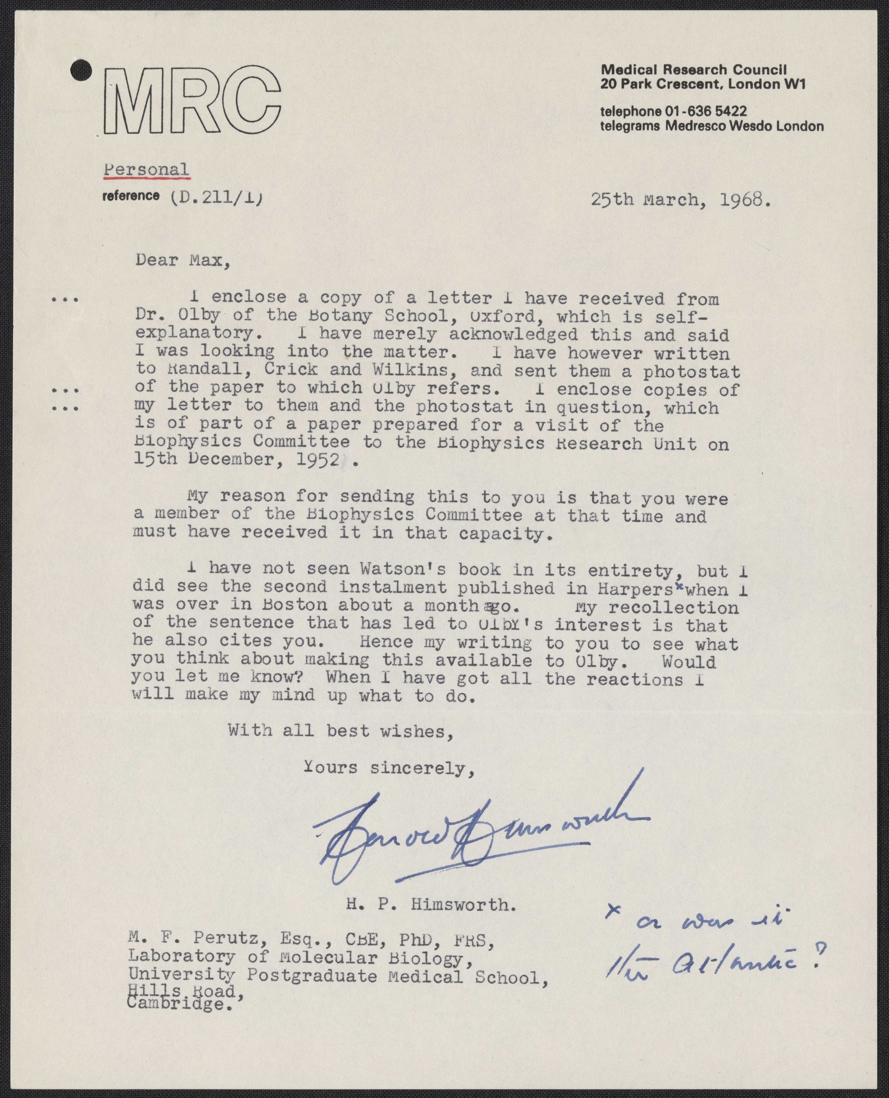 Letter from Harold Himsworth to Max Perutz, March 25, 1968