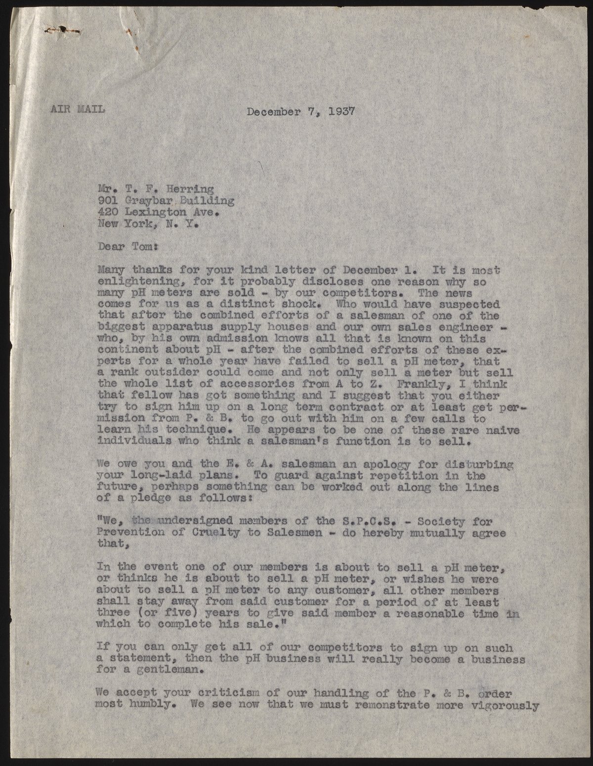 Beckman, Arnold O. “Letter from Arnold Beckman to Thomas Herring,” December 7, 1937. Beckman Historical Collection, Box 14, Folder 9. Science History Institute. Philadelphia. https://digital.sciencehistory.org/works/5h73pw43z.