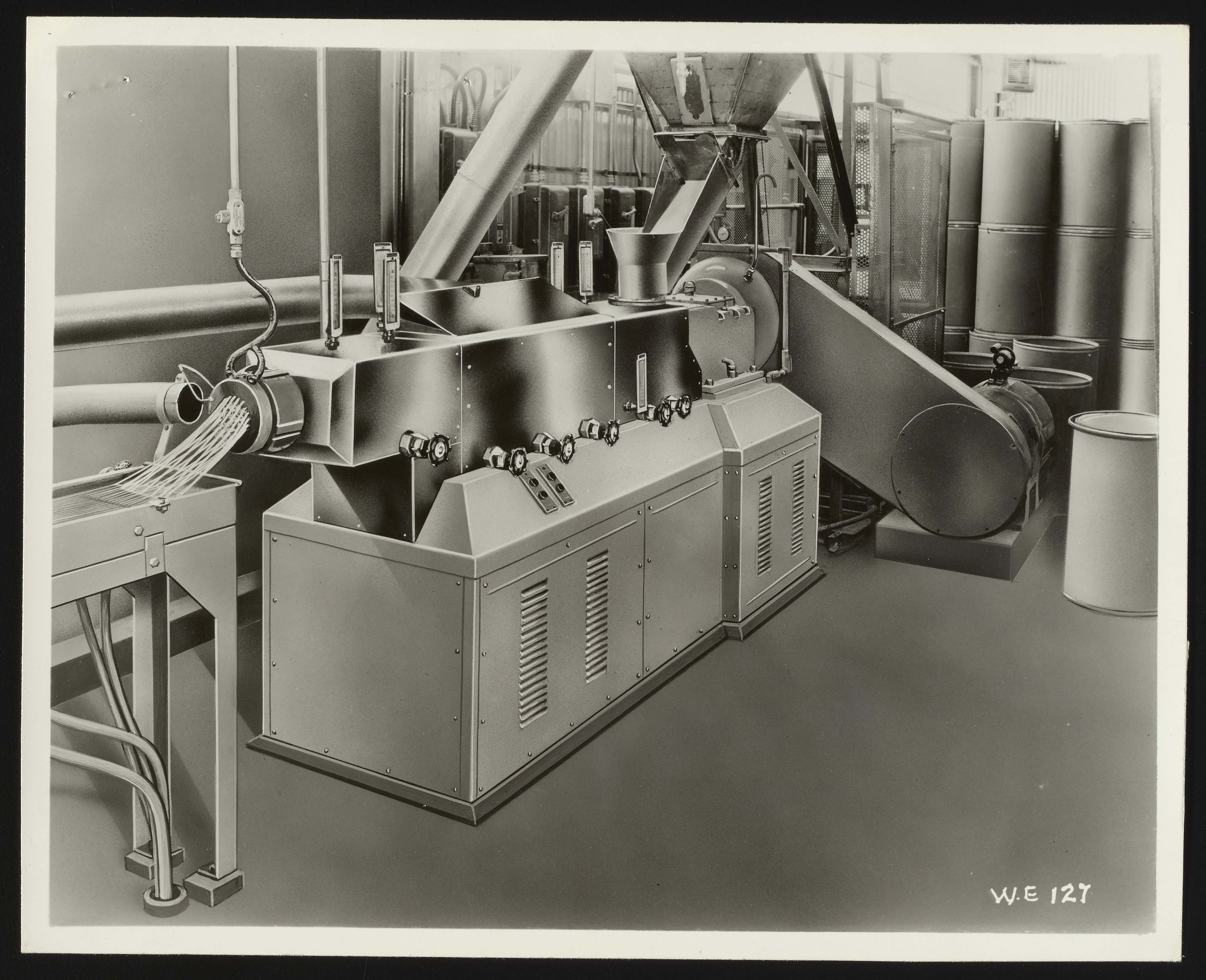 Hercules Incorporated. “Extruder at Hercules Parlin Plant,” May 1, 1951. Photographs from the Records & Ephemera of Hercules Incorporated, Box 2, Folder 25. Science History Institute. Philadelphia. https://digital.sciencehistory.org/works/5h73px061.