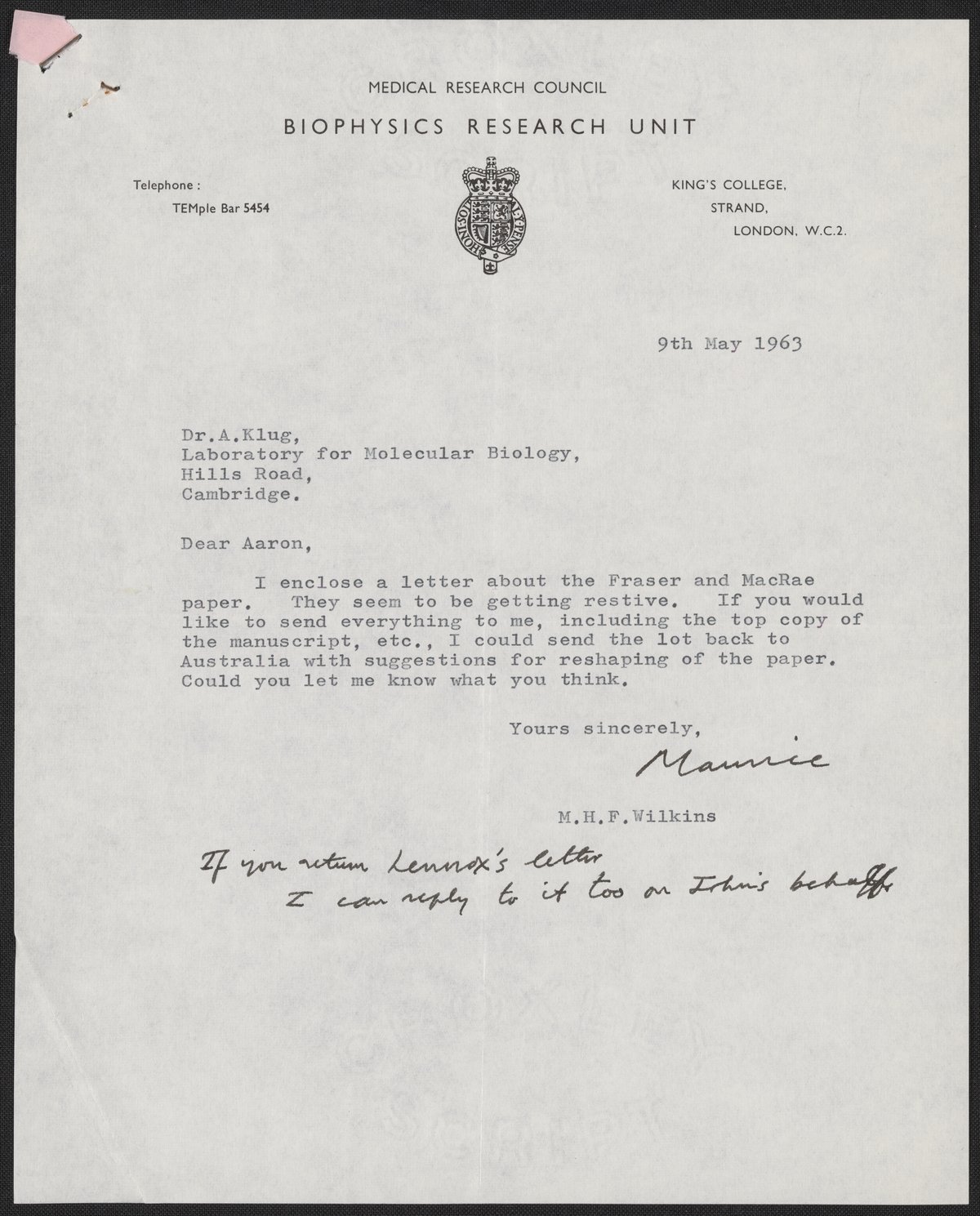 Letter from Aaron Klug (1926-2018) to Maurice Wilkins (1916-2004), written May 10, 1963.