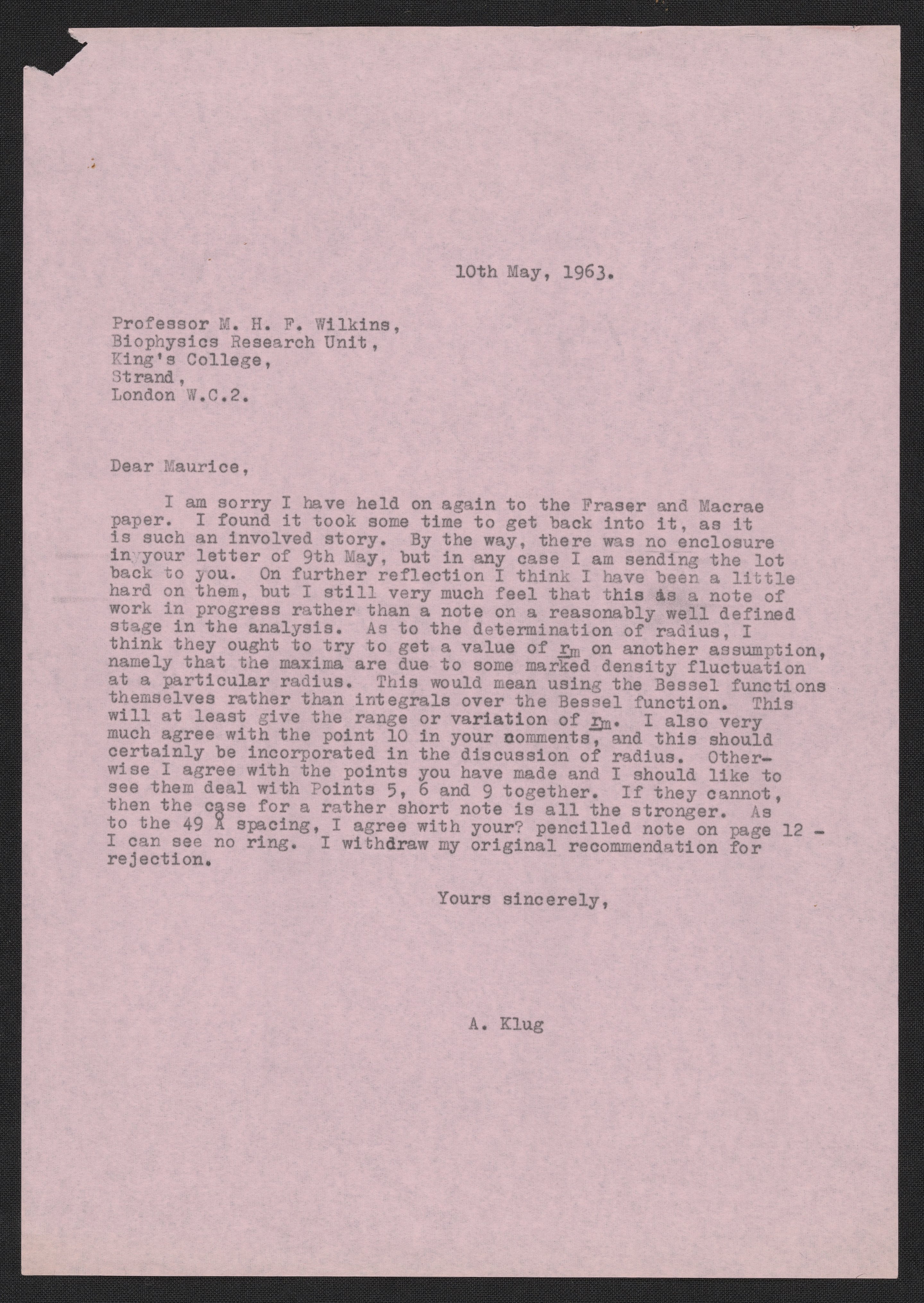Letter from Aaron Klug to Maurice Wilkins, May 10, 1963