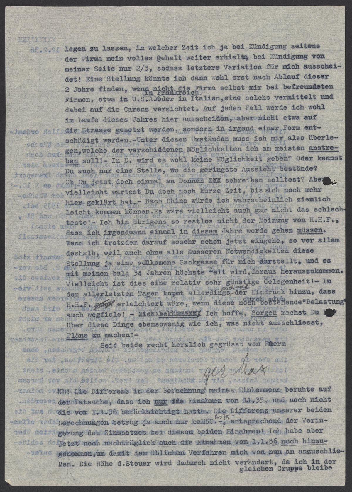 legen zu lassen, in welcher Zeit ich ja bei Kündigung seitens der Firma mein volles Gehalt weiter erhielten, bei Kündigung von meiner Seit nur 2/3, sodass letztere Variation für mich ausscheidet! Eine Stellung könnte ich dann wohl erst nach Ablauf dieser 2 Jahre finden, wenn nicht die Firma selbst mir bei befreundeten Firma, etwa in U.S.A, in Frankreich, oder in Italien, eine solche vermittelt und dabei auf die Carenz verzichtet. Auf jeden Fall werde ich wohl im Laufe dieses Jahres hier ausscheiden, aber nicht etwa auf die Strasse gesetzt werden, sondern in irgend einer Form entschädigt werden. – Unter diesen Umständen muss ich mir also überlegen, welche der verschiedenen Möglichkeiten ich am meisten anstreben soll! – In D. wird es wohl keine Möglichkeit geben? Oder kennst Du auch nur eine Stelle, wo die geringste Aussicht bestände? Ob Du jetzt doch einmal an Donnan schreiben solltest? Aber vielleicht wartest Du doch noch kurze Zeit, bis sich noch mehr hier geklärt hat. – Nach China würde ich wahrscheinlich ziemlich leicht kommen können. Es wäre vielleicht auch gar nicht das schlechteste! Ich bin übrigens so restlos nicht der Meinung von H.H.F., dass ich irgendwann einmal in diesem Jahren werde gehen müssen. Wenn ich trotzdem darauf so sehr schon jetzt eingehe, so vor allem deshalb, weil auch ohne alle äusseren Notwendigkeiten diese Stellung ja eine vollkommene Sackgasse für mich darstellt, und es mit meinen bald 34 Jahren höchste Zeit wird daraus herauszukommen. Vielleicht ist dies eine relativ sehr günstige Gelegenheit! – In den allerletzten Tagen kommt allerdings auch mal der Eindruck hinzu, dass H.H.F erleichtert wäre, wenn diese noch durch mich bestehende „Belastung“ auch wegfiele. Ich hoffe, Sorgen machst Du über diese Dinge ebensowenig wie ich, was nicht ausschließt, Pläne zu machen! –