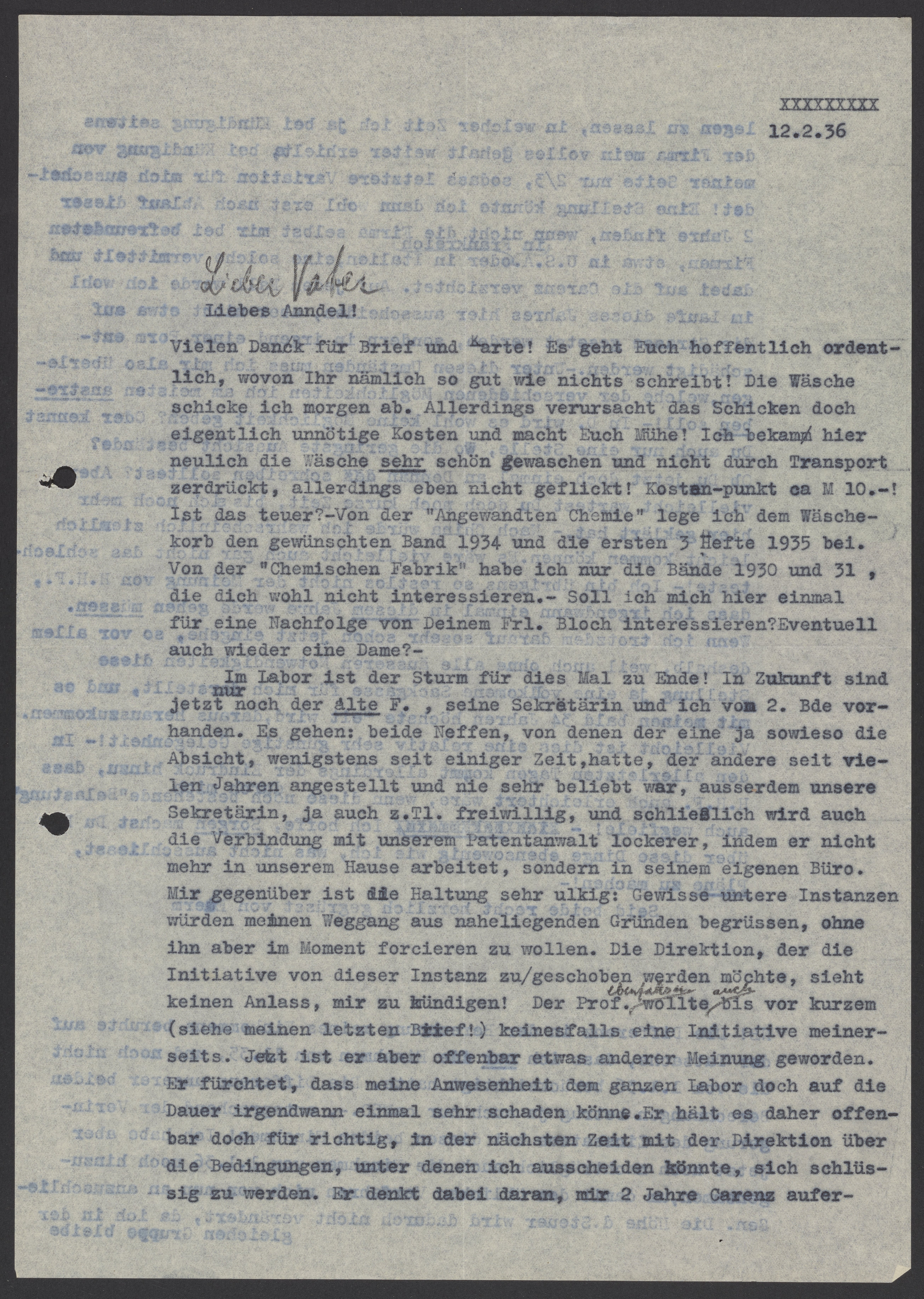 Thank you very much for the letter and postcard! I hope you are doing well, which you hardly write about! I’ll send off the laundry tomorrow. However, shipping the laundry creates unnecessary costs and is inconvenient for you all. I recently had my laundry washed here and it was not wrinkled or damaged during transport. It costed about 10 Marks. Is that expensive? I am placing the requested 1934 issue and the first three 1935 issues of “Angewandte Chemie” in the laundry basket. I only have the 1930 and 1931 issues of “Chemischen Fabrik”, which probably don’t interest you. Should I be interested in the successor to Ms. Bloch? Will it be a lady again?