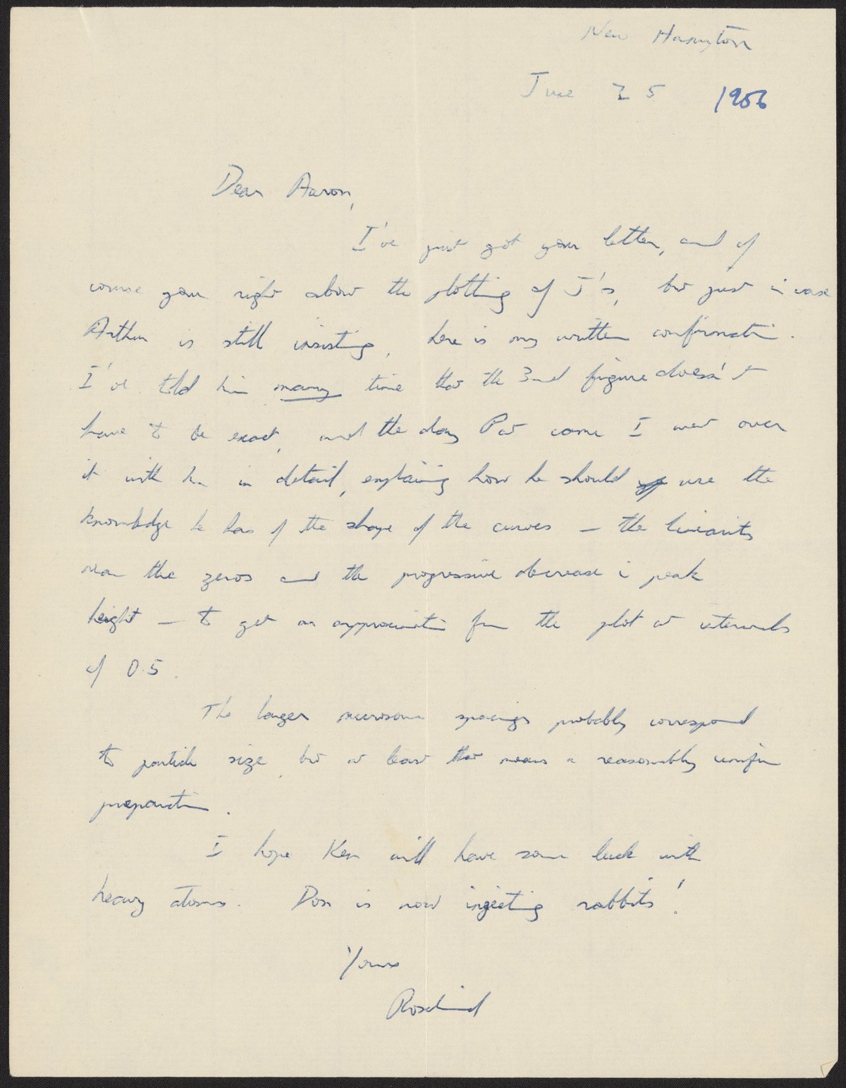 Letter from Rosalind Franklin (1920-1958) to Aaron Klug (1926-2018) discussing scientific matters. Sent from New Hampton, New Hampshire while Franklin was attending a Gordon Research Conference in 1956.