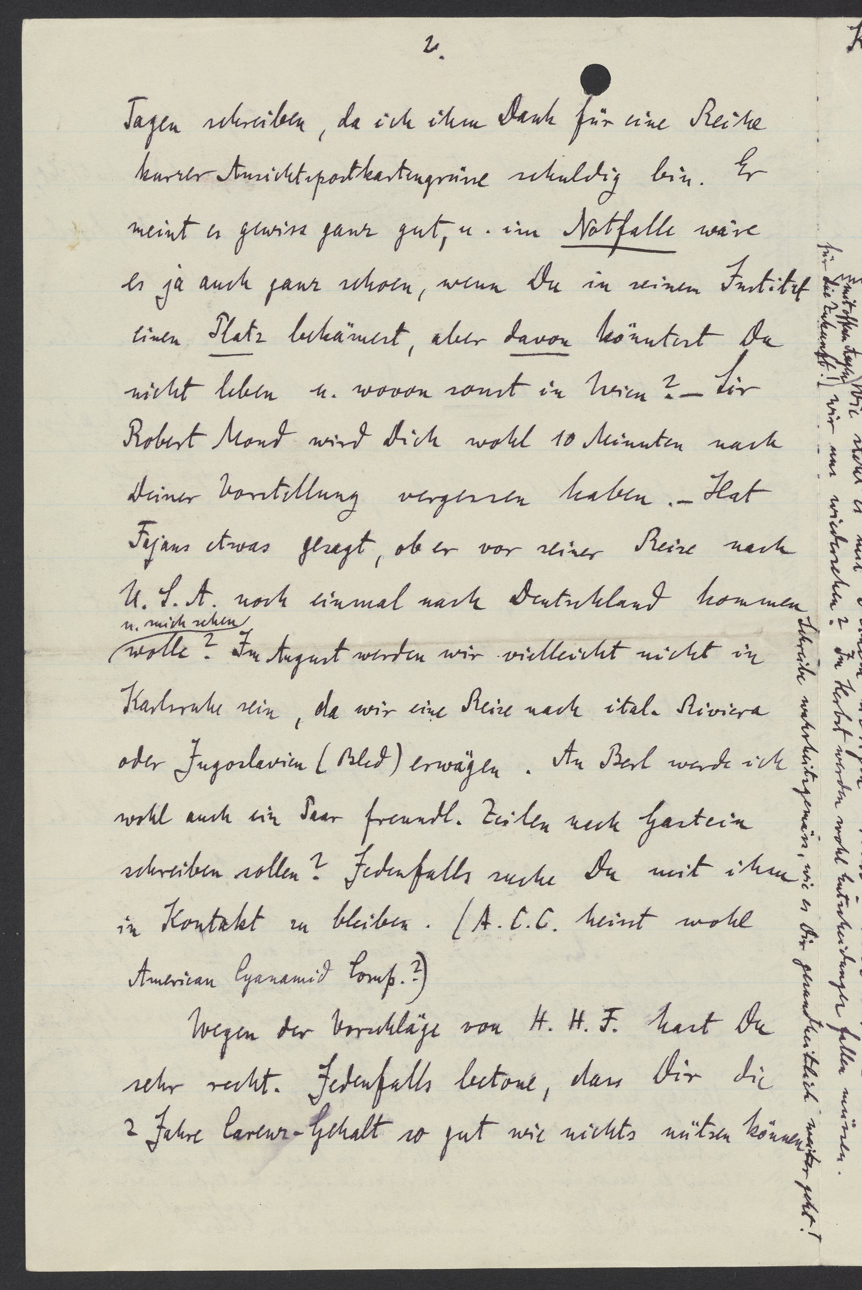 Tagen schreiben, da ich ihm Dank für eine Reihe kurzer Ansichtspostkartengrüsse schuldig bin. Er meint es gewiss ganz gut, u. im Notfalle wäre es ja auch ganz schön, wenn Du in seinem Institut einen Platz bekämest, aber davon könntest Du nicht leben u. wovon sonst in Wien? – Sir Robert Mond wird Dich wohl 10 Minuten nach Deiner Vorstellung vergessen haben. – Hat Fajans etwas gesagt, ob er vor seiner Reise nach U.S.A noch einmal nach Deutschland kommen u. mich sehen wolle? Im August werden wir vielleicht nicht in Karlsruhe sein, da wir eine Reise nach ital. Riviera oder Jugoslawien (Bled) erwägen. An Berl werde ich wohl auch ein Paar freundl. Zeilen nach Gasten schreiben sollen? Jedenfalls suche Du mit ihm in Kontakt zu bleiben. (A.C.C. heisst wohl American Cyanamid Comp.?)