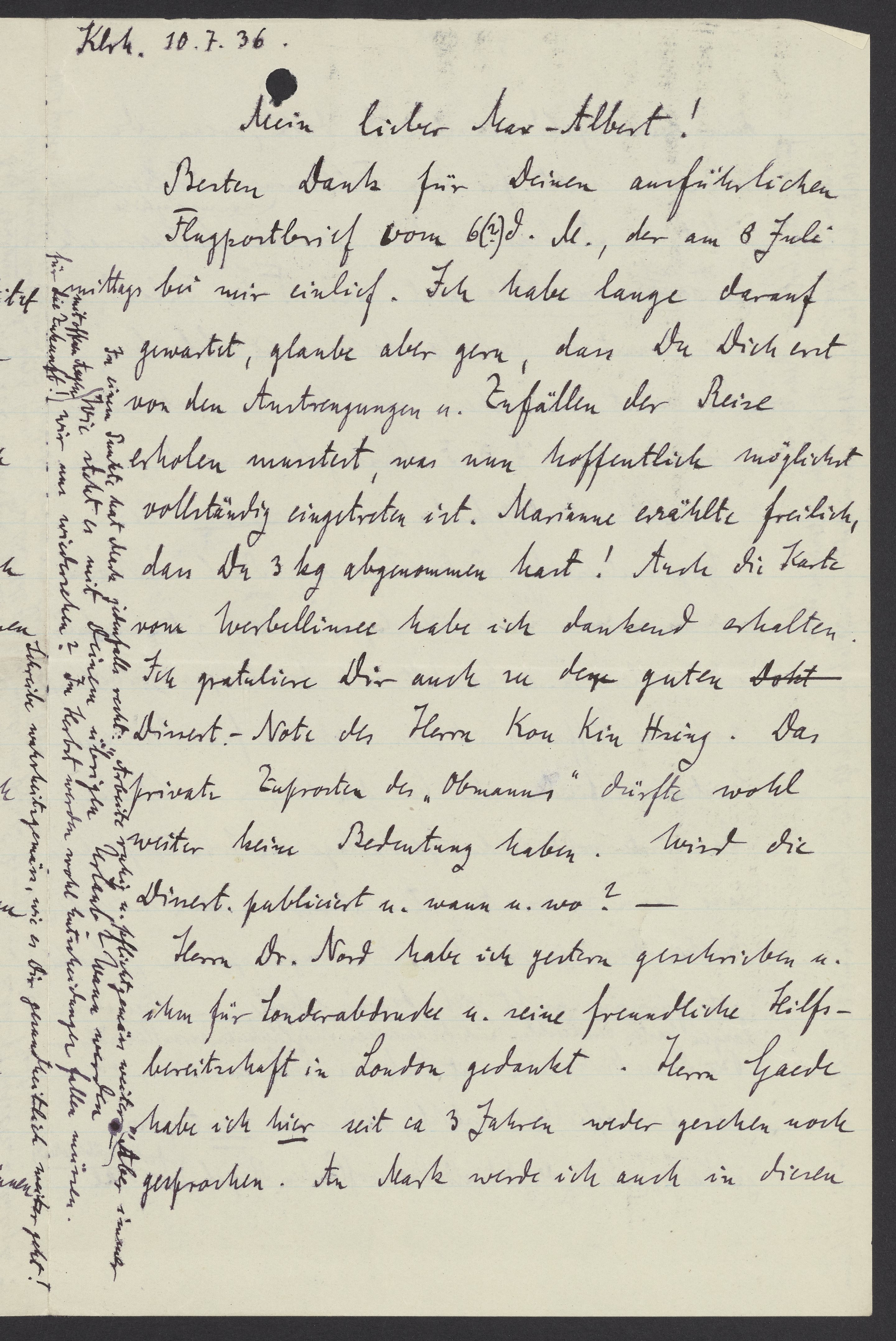 Besten Dank für Deinen ausführlichen Flugpostbrief vom 6 (?) d. M., der am 8. Juli mittags bei mir einlief. Ich habe lange darauf gewartet, glaube aber gern, dass Du Dich erst von den Anstrengungen u. Zufällen der Reise erholen musstest, was nun hoffentlich möglichst vollständig eingetreten ist. Marianne erzählte freilich, dass Du 3 kg. abgenommen hast! Auch die Karte vom Werbellinsee habe ich danken erhalten.