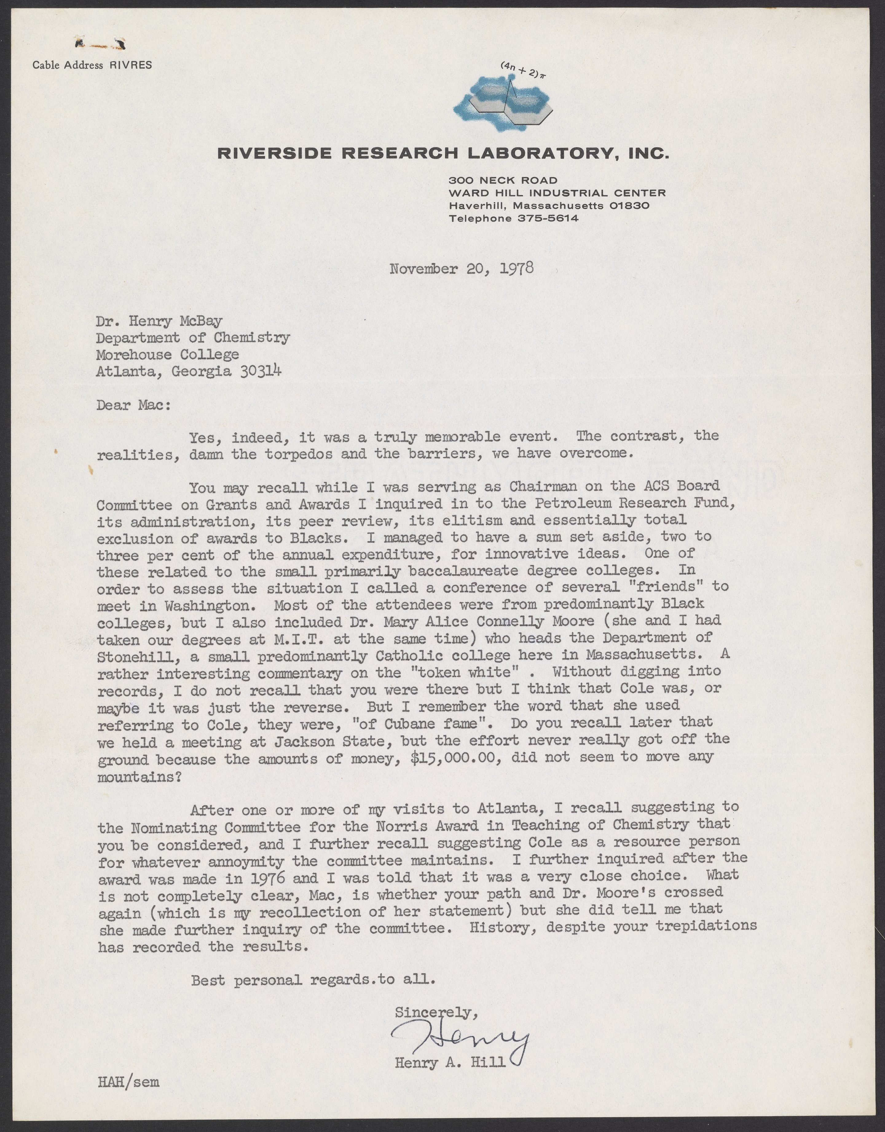 Hill, Henry Aaron. “Letter from Henry A. Hill to Henry McBay,” November 20, 1978. Henry C. McBay Papers, Box 1, Folder 71. Science History Institute. Philadelphia. https://digital.sciencehistory.org/works/5l15b5i.