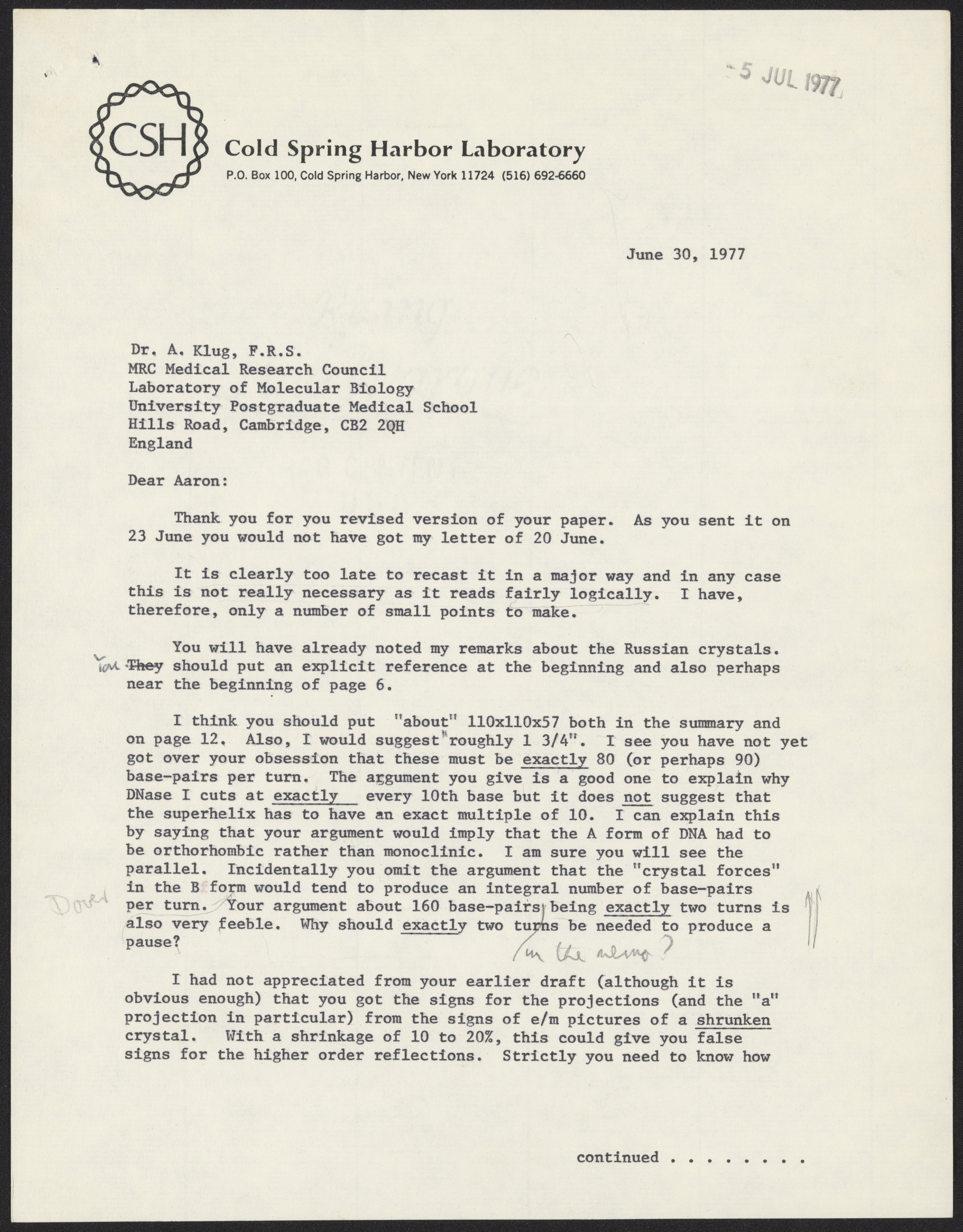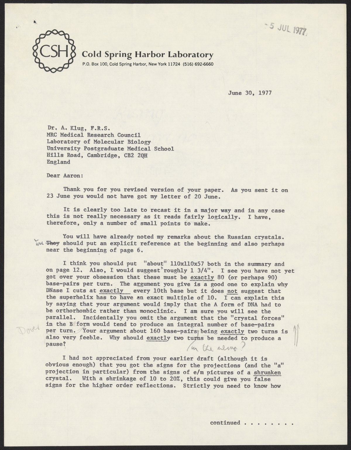 Crick, Francis. “Letter from Francis Crick to Aaron Klug, June 30, 1977,” June 30, 1977. History of Molecular Biology Collection, Box 20, Folder 1. Science History Institute. Philadelphia. https://digital.sciencehistory.org/works/5l8g69o.