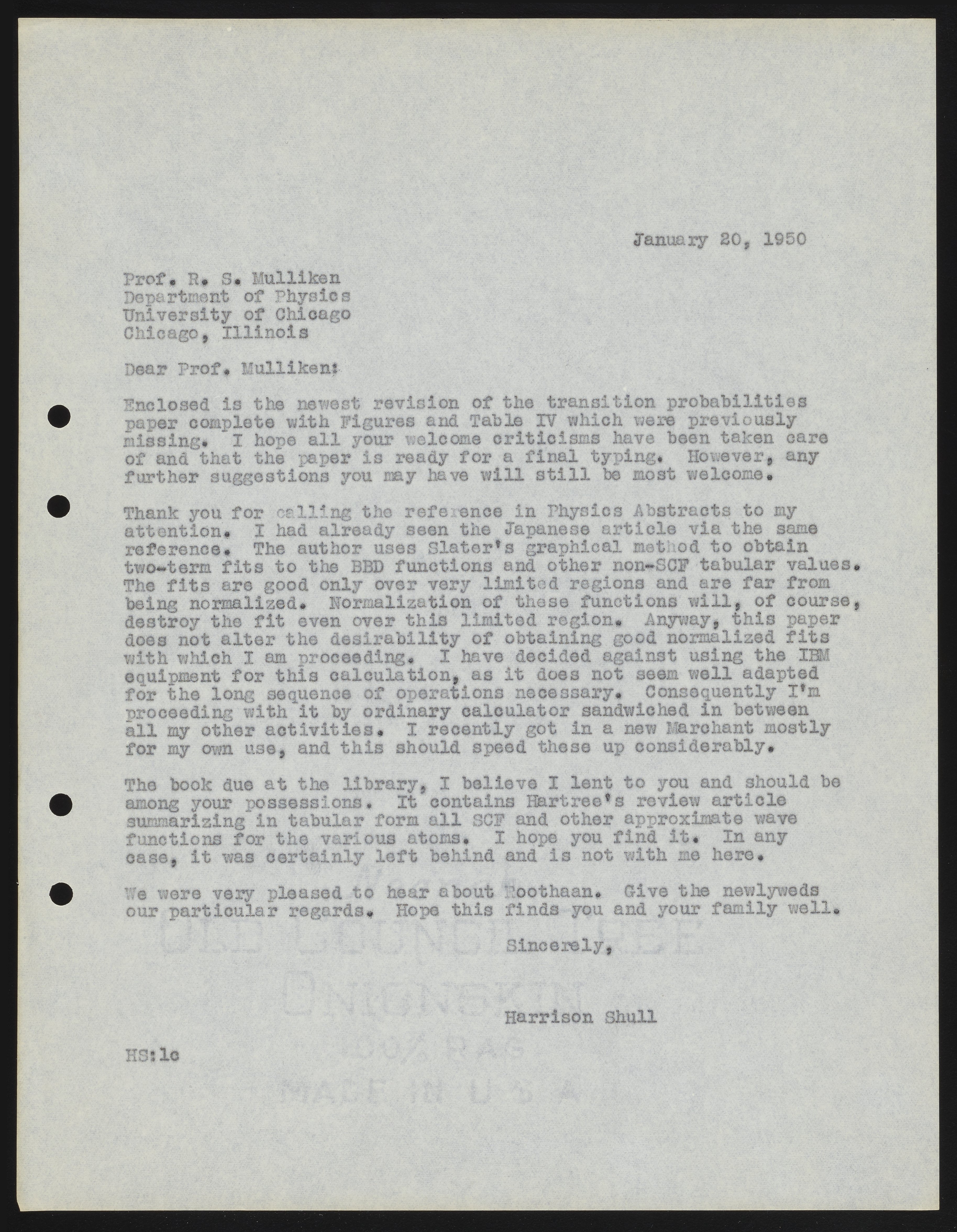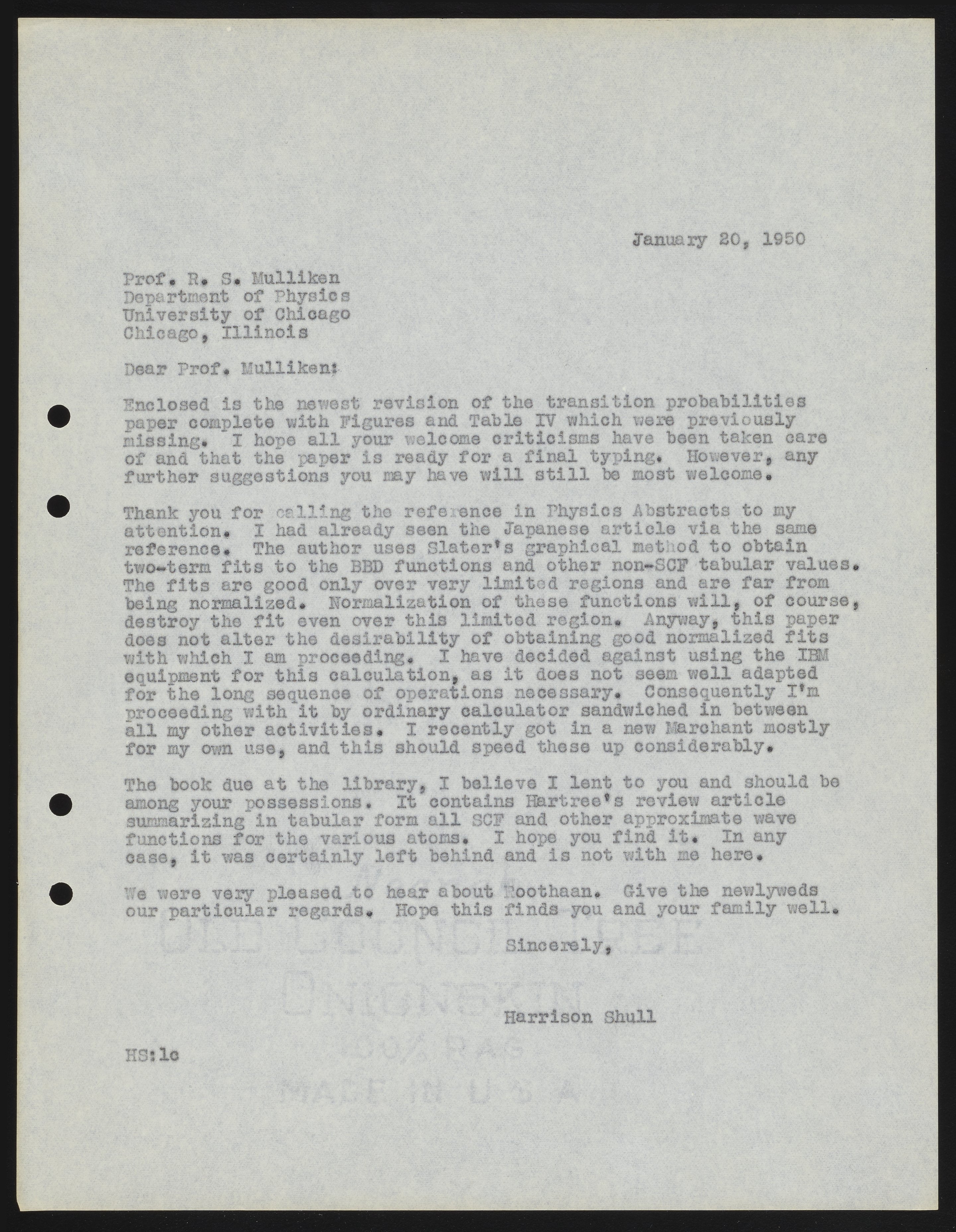 Shull, Harrison. “Letter from Harrison Shull to Robert S. Mulliken, 1950,” January 20, 1950. Robert S. Mulliken & Harrison Shull Correspondence, Box 1. Science History Institute. Philadelphia. https://digital.sciencehistory.org/works/5m60qs01p.