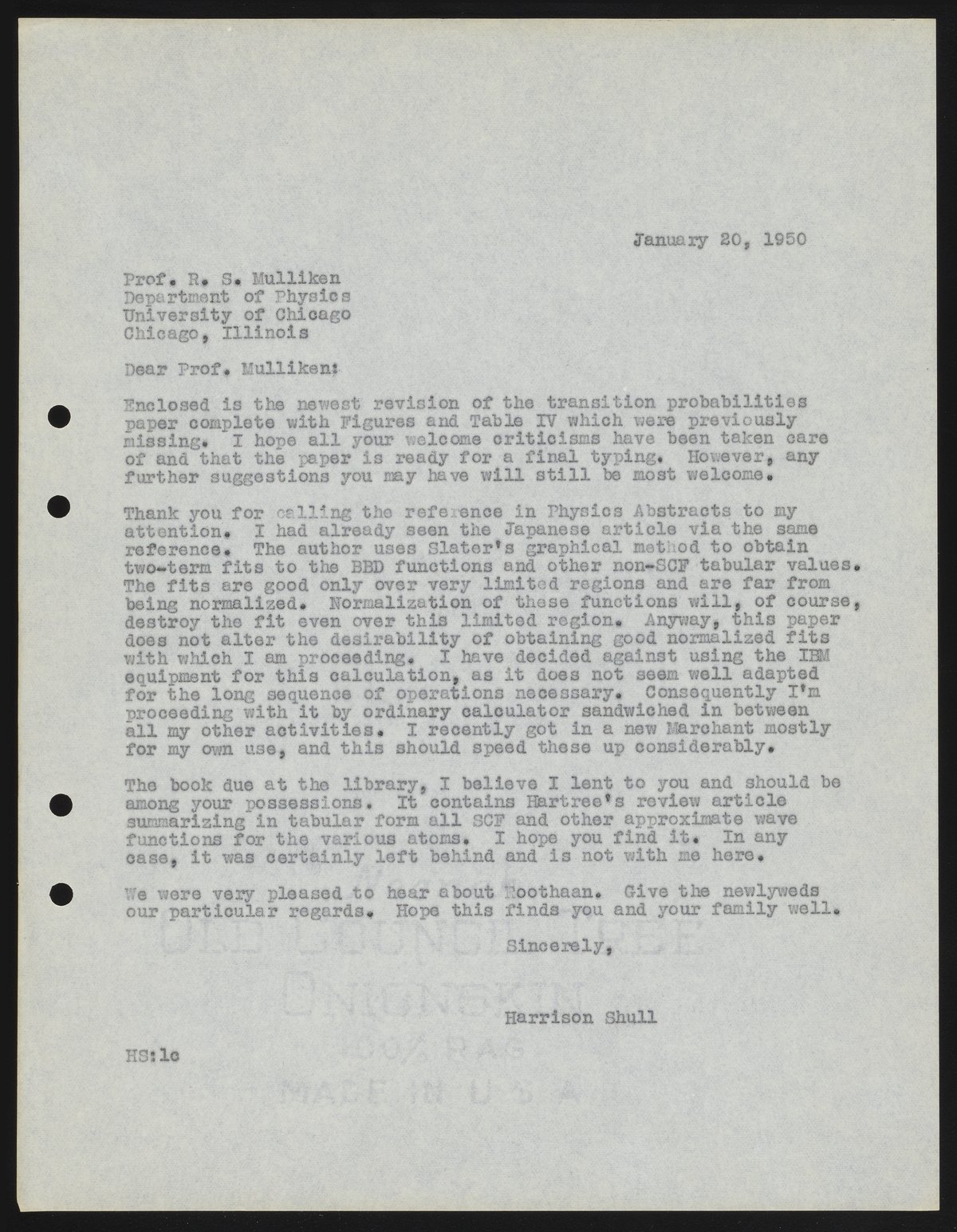 Letter from Harrison Shull to Robert S. Mulliken, 1950