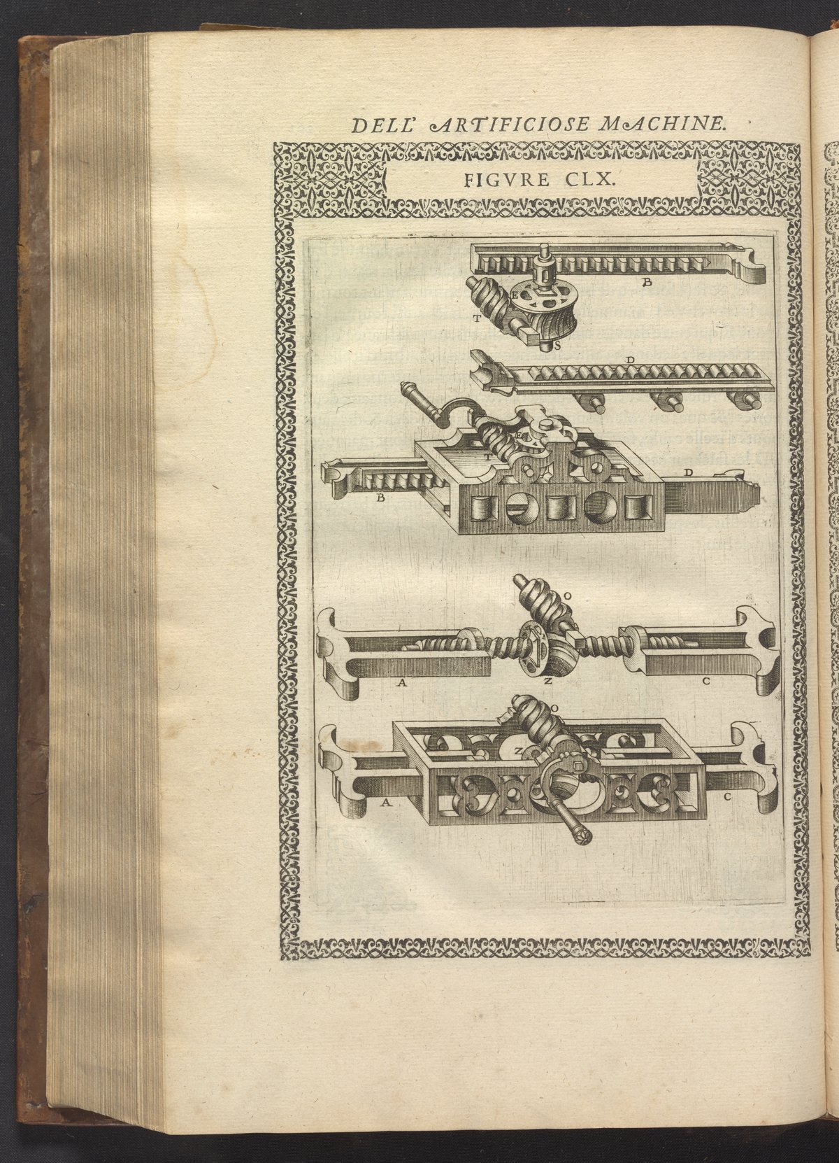 Ramelli, Agostino. “Plate 160: Screw-Jack for Bending the Iron Gratings of a Defensive Grille.” In Le Diverse Et Artificiose Machine Del Capitano Agostino Ramelli. Paris, France, 1588. https://digital.sciencehistory.org/works/5m60qs09w.