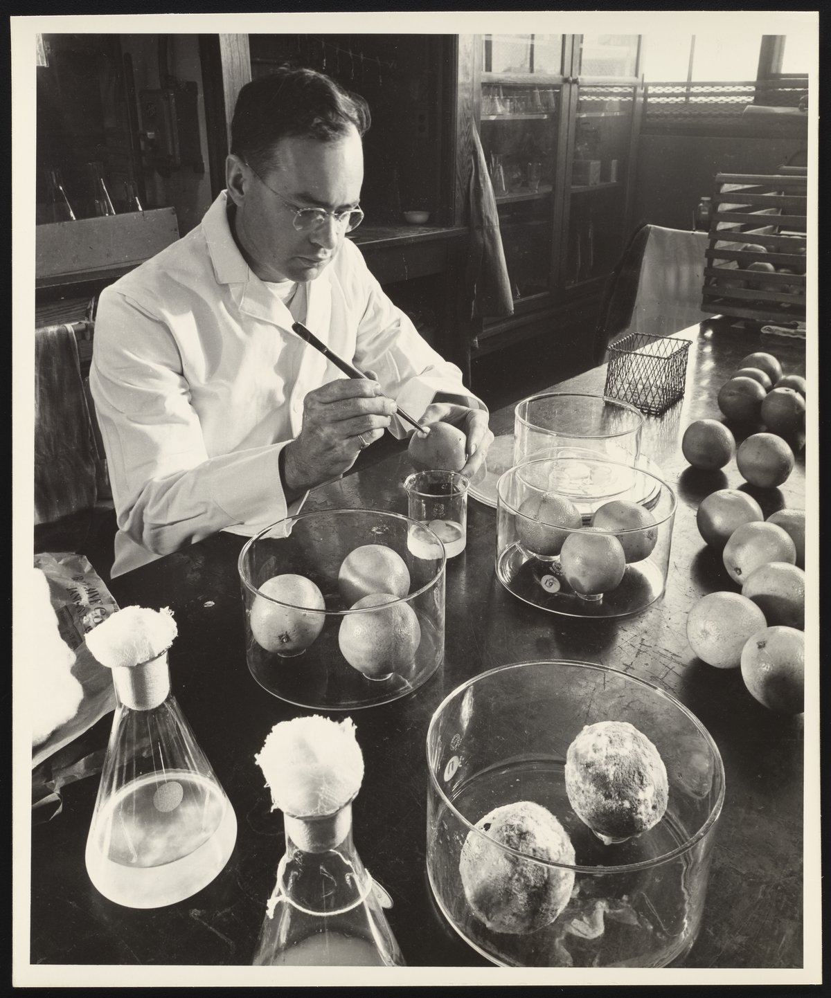 General view of an unidentified employee conducting an experiment with assorted fruit specimens in the Dow Chemical Company's Biological Chemical Laboratory. The laboratory commonly conducted research and testing related to the development of a range of biologically active products for use in the pharmaceutical, biological, animal healthcare, and agricultural industries.