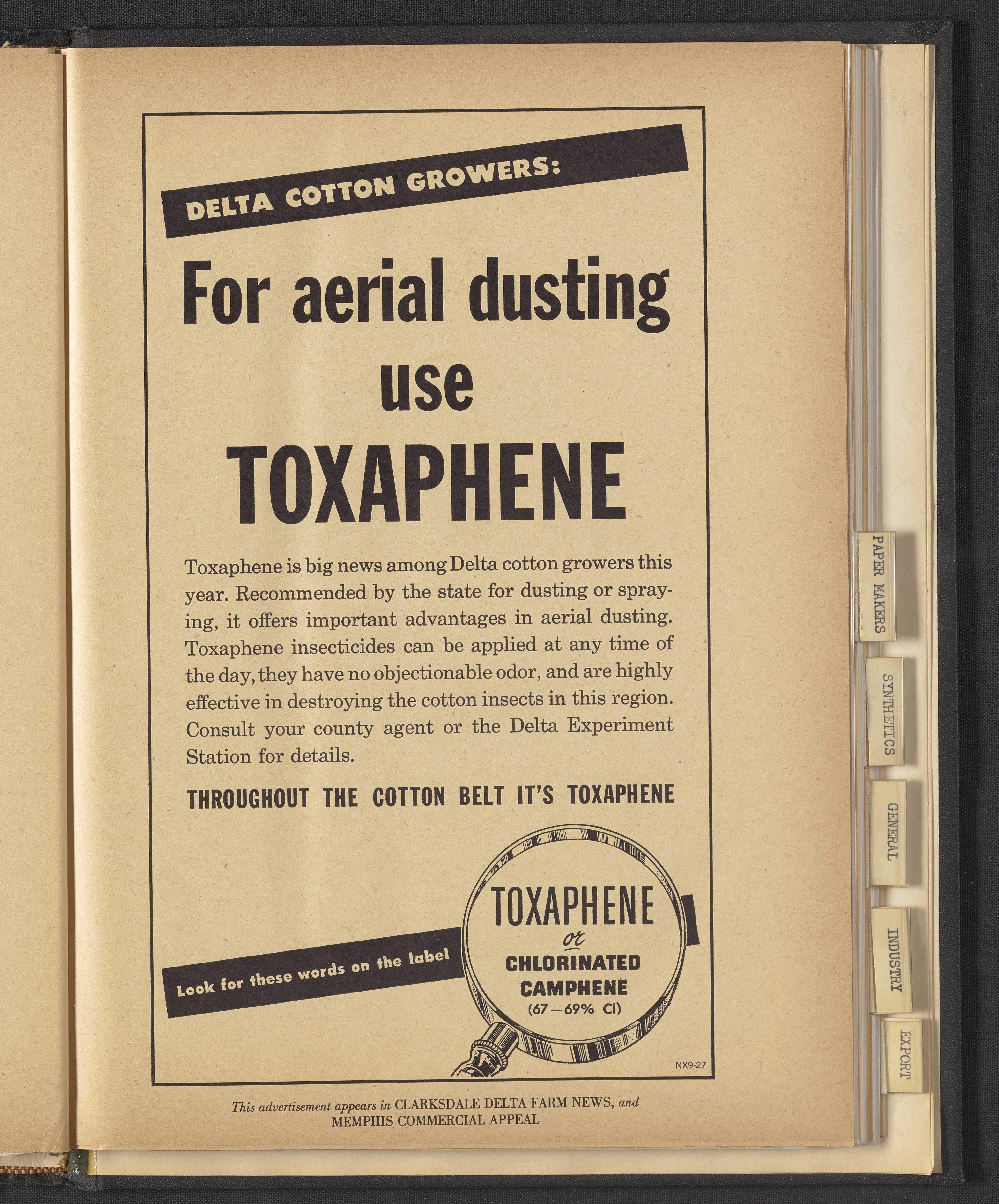 Hercules Incorporated. “Delta Cotton Growers: For Aerial Dusting Use Toxaphene.” 1949 Hercules Advertisements, 1949. Records of Hercules Incorporated, Volume 1949. Science History Institute. Philadelphia. https://digital.sciencehistory.org/works/5m60qs568.