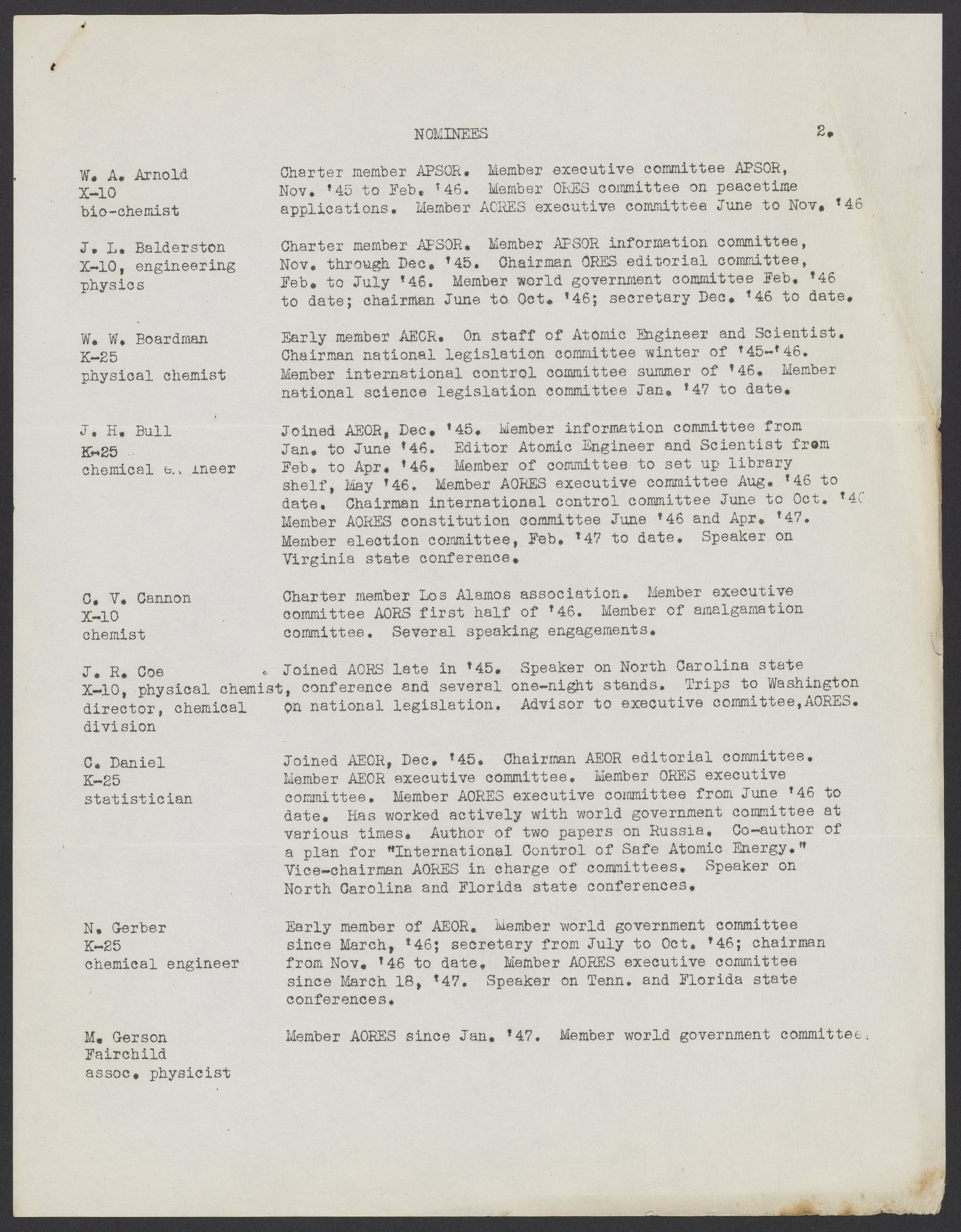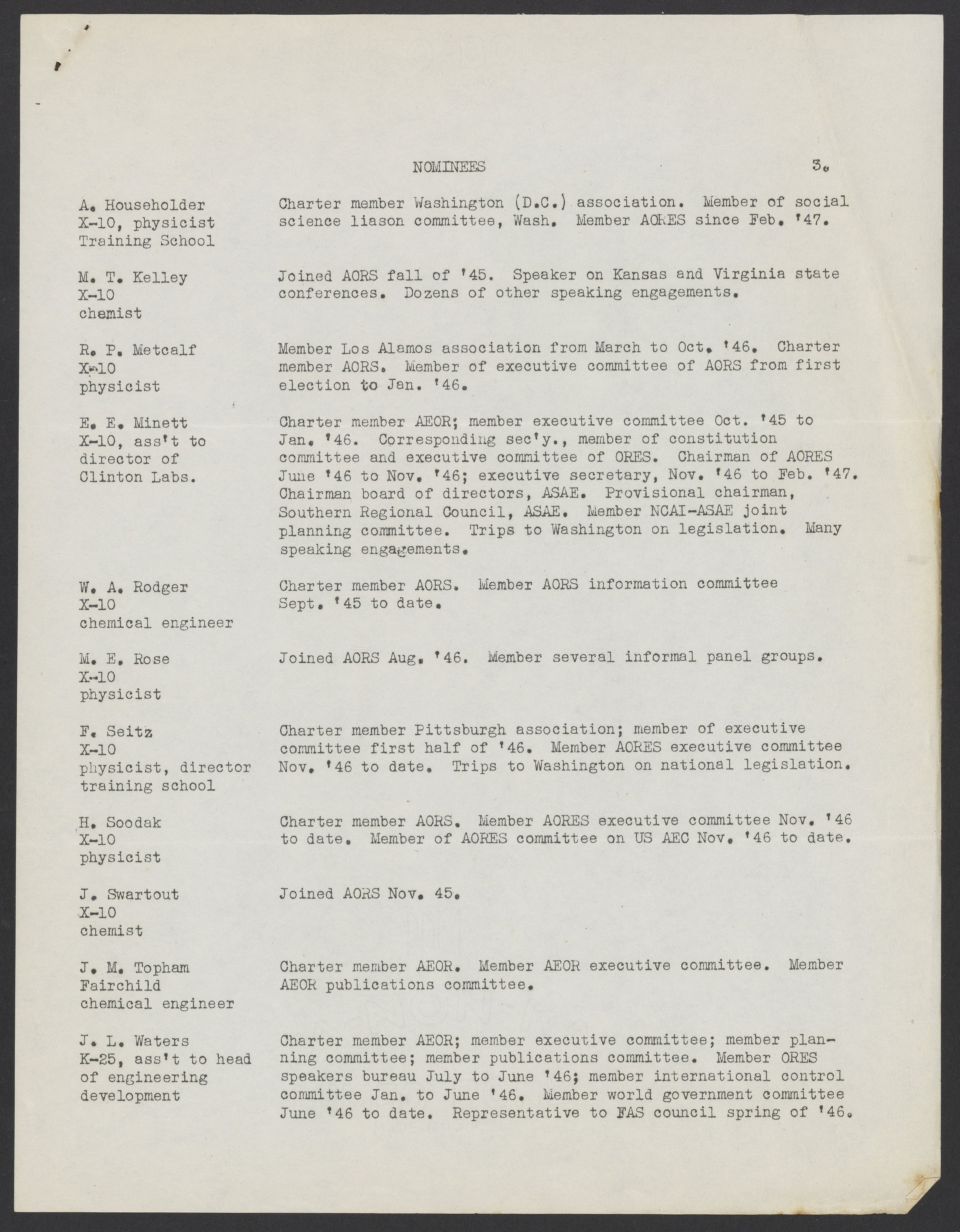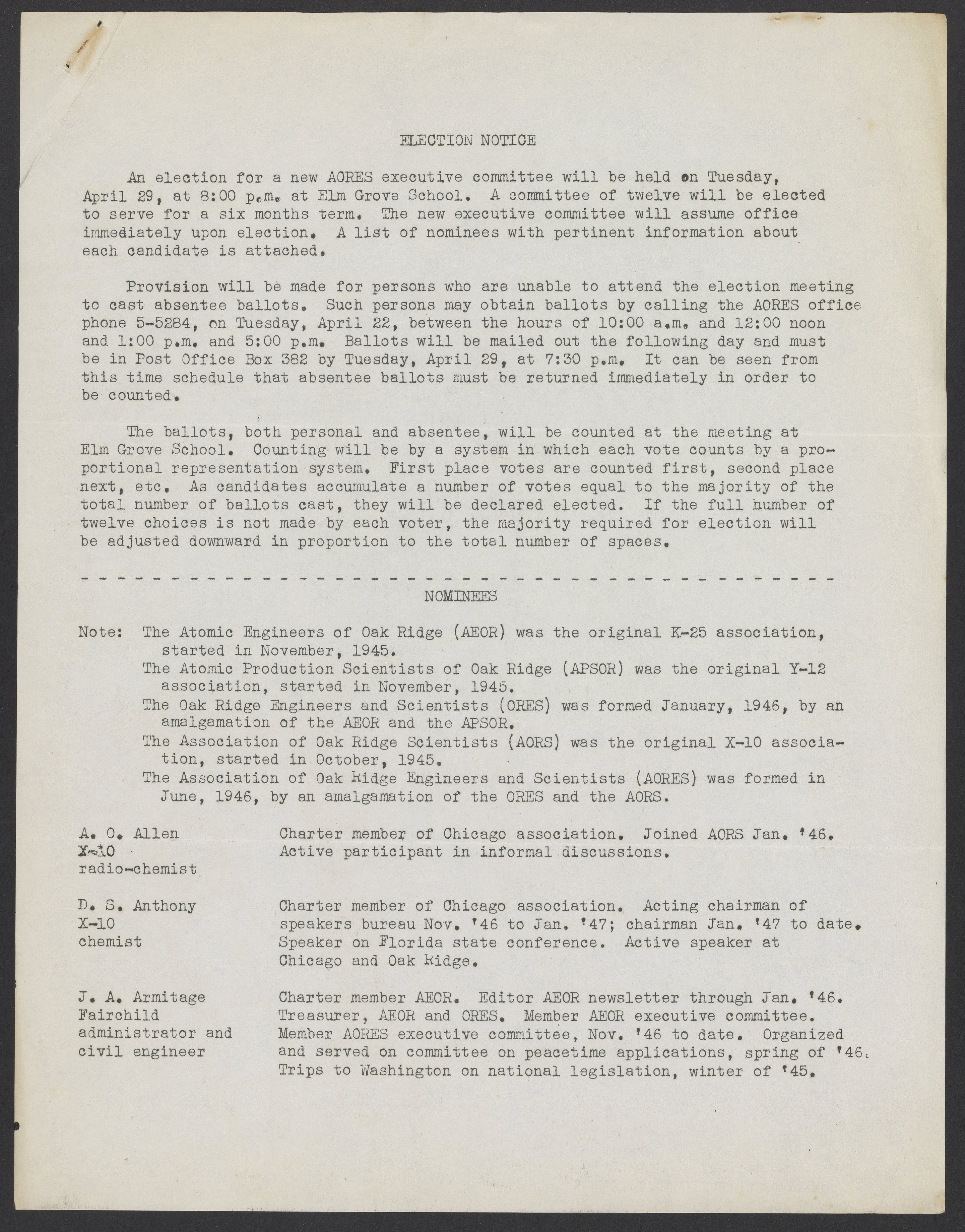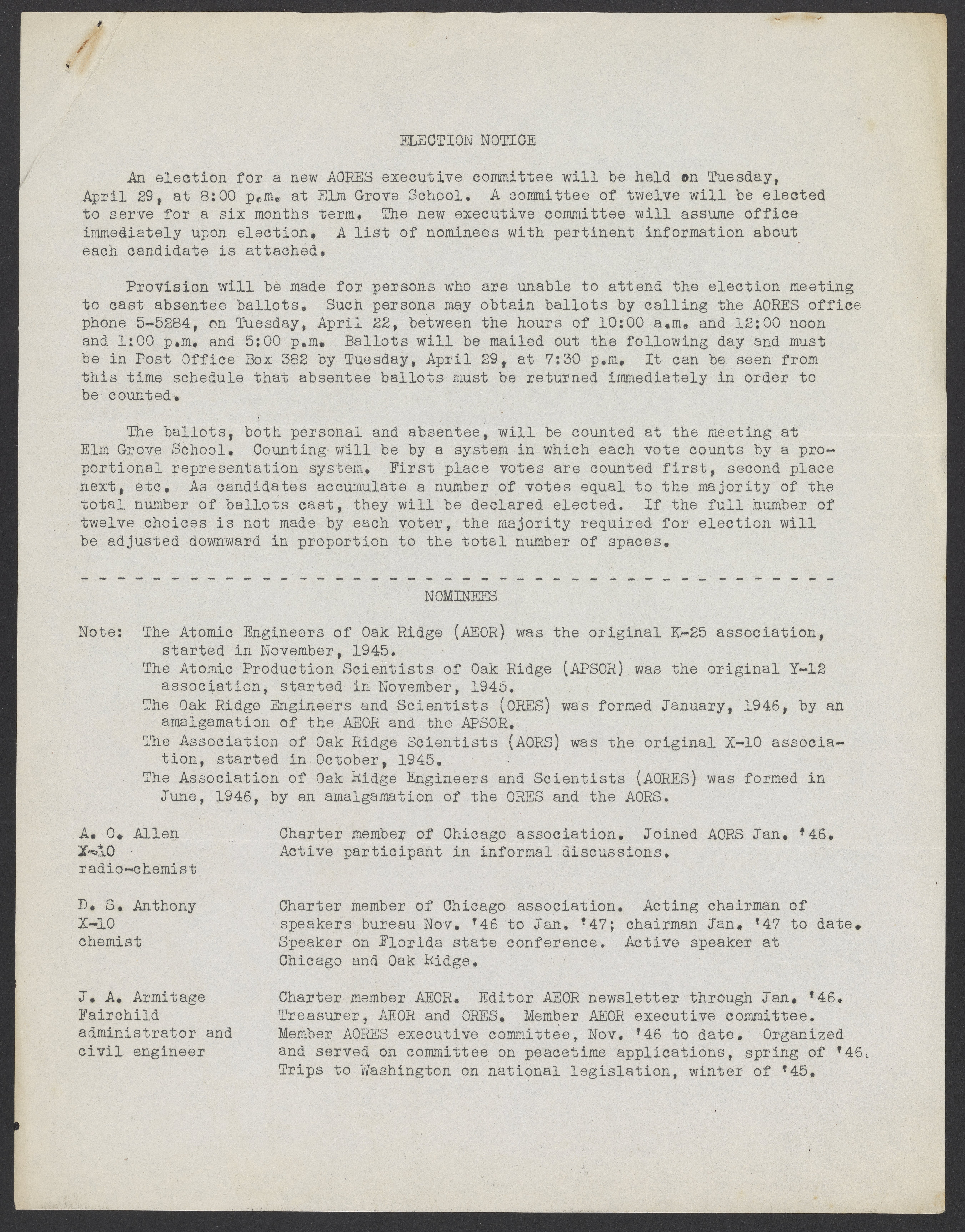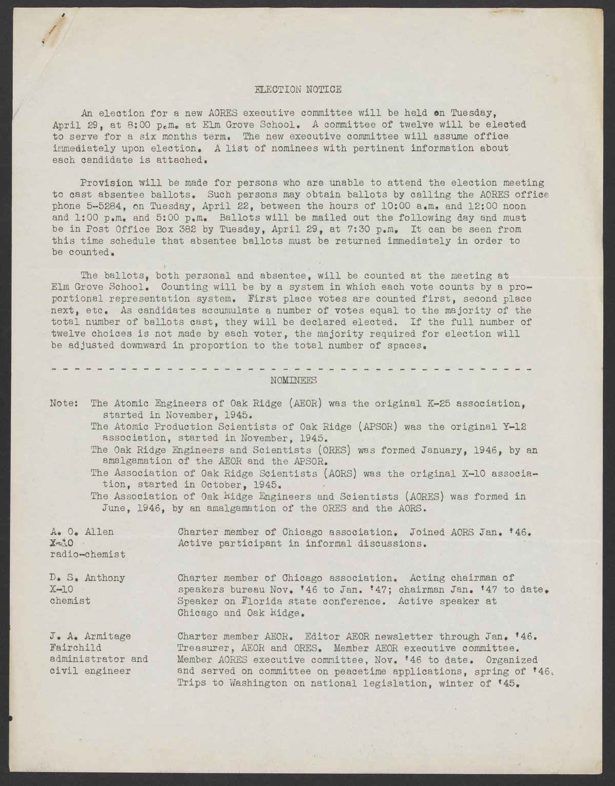 Small JPG1200 x 1532px — 320 KBLarge JPG2880 x 3677px — 1.8 MBFull-sized JPG5403 x 6899px — 6.5 MBOriginal fileTIFF — 5403 x 6899px — 107 MBNomination notice for new members of the executive committee of the Association of Oak Ridge Engineers and Scientists (AORES). Following the notice is a list of nominees and a small biography. The election is planned to be held on April 29, 1947.