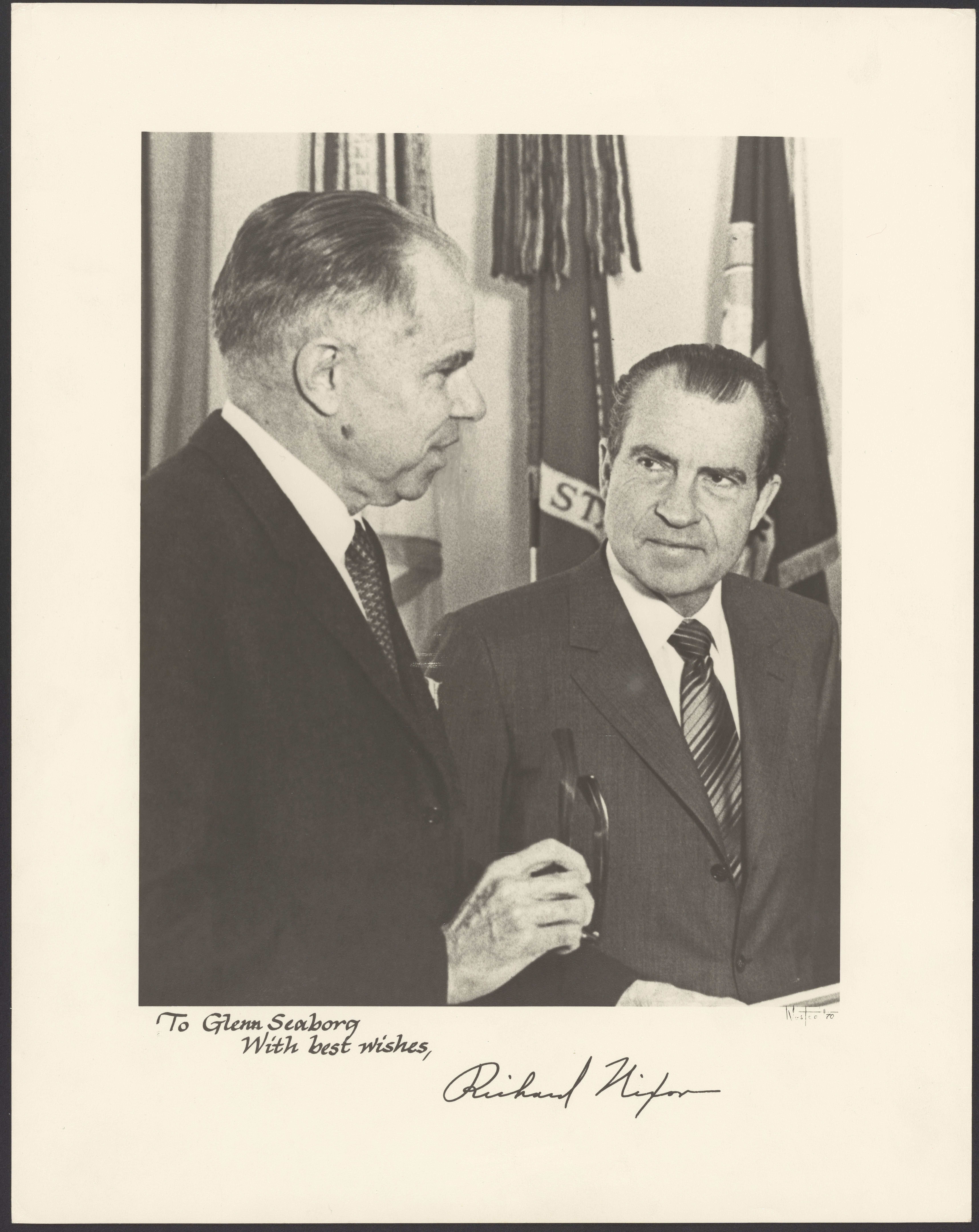 Black and white photograph of Glenn Seaborg (1912-1999) standing next to President Richard M. Nixon (1913-1994). Nixon has inscribed the photograph with his signature and a note, "To Glenn Seaborg, with best wishes."