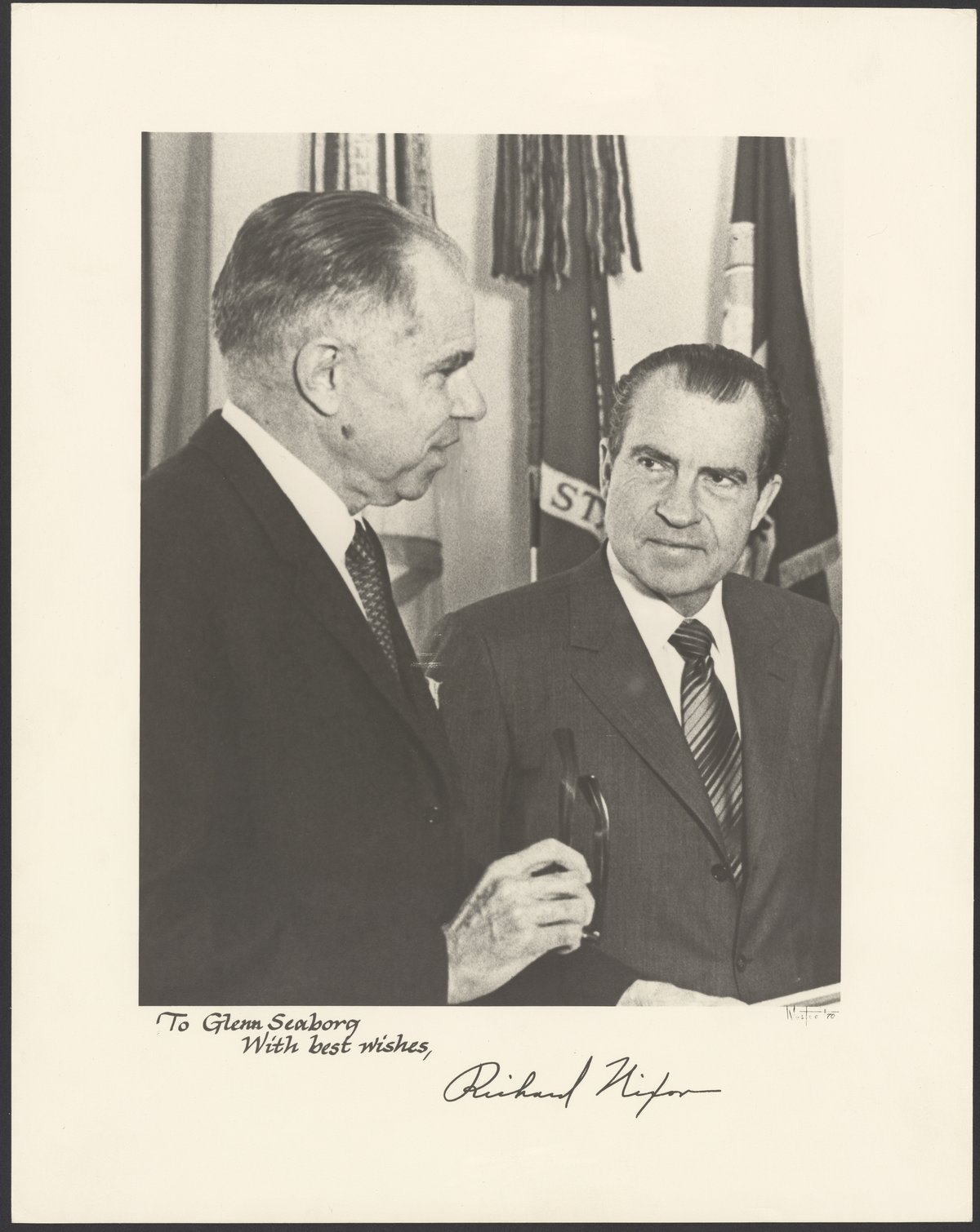 “Glenn Seaborg and Richard Nixon,” 1970. Records of the Lawrence Berkeley National Laboratory - Nuclear Division. Science History Institute. Philadelphia. https://digital.sciencehistory.org/works/5ninycj.