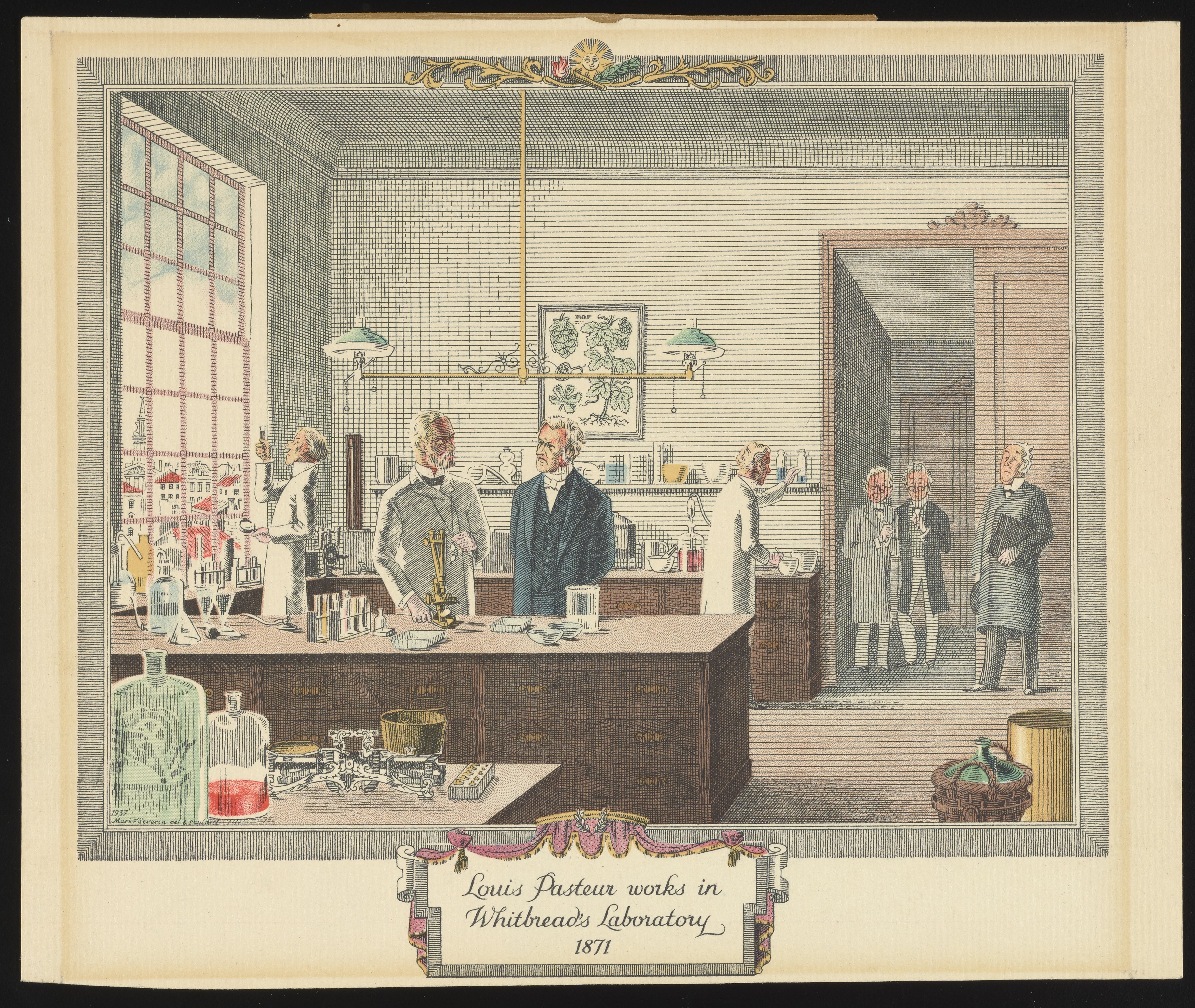 Severin, Mark F. “Colored Engraving Depicting Louis Pasteur at Work in the Laboratory of Whitbread's Brewery in London in 1871,” 1937. Fisher-Pasteur Memorial Collection, Box 1, Folder 17. Science History Institute. Philadelphia. https://digital.sciencehistory.org/works/5q47rn894.