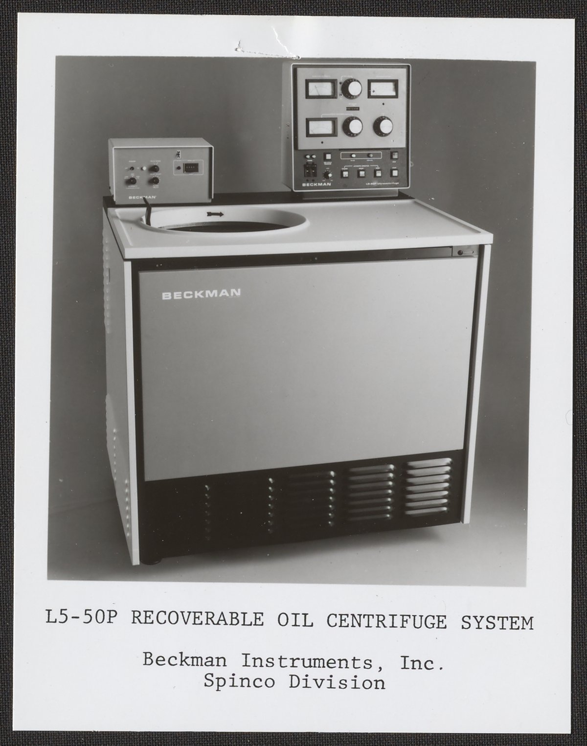 “Beckman L5-50P Recoverable Oil Centrifuge System,” 1973–1982. Beckman Historical Collection, Box 84. Science History Institute. Philadelphia. https://digital.sciencehistory.org/works/5q47rp105.