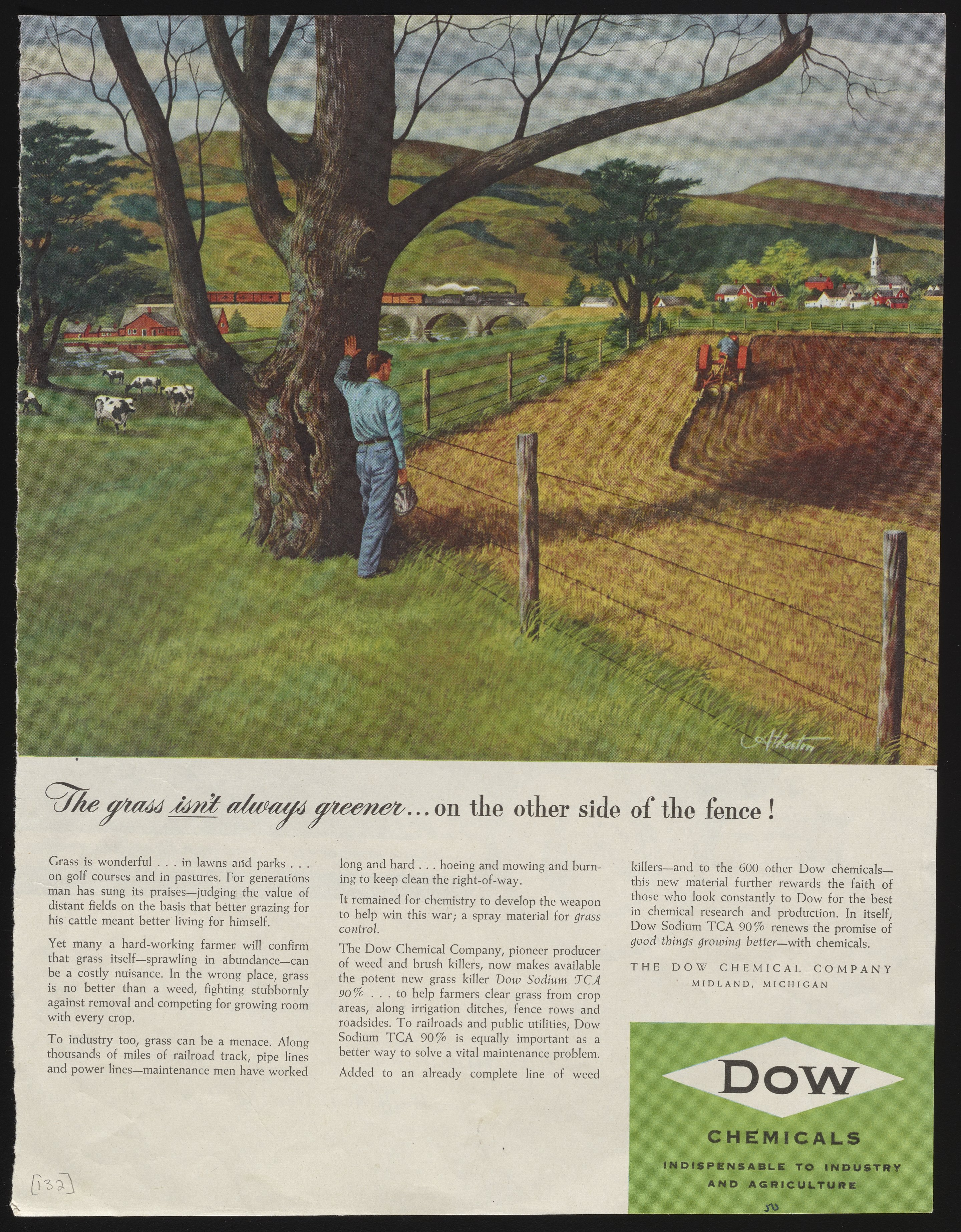 Dow Chemical Company. “The Grass Isn't Always Greener...on the Other Side of the Fence!,” May 13, 1950. Advertisements from the Dow Chemical Historical Collection, Box 7. Science History Institute. Philadelphia. https://digital.sciencehistory.org/works/5q47rp483.