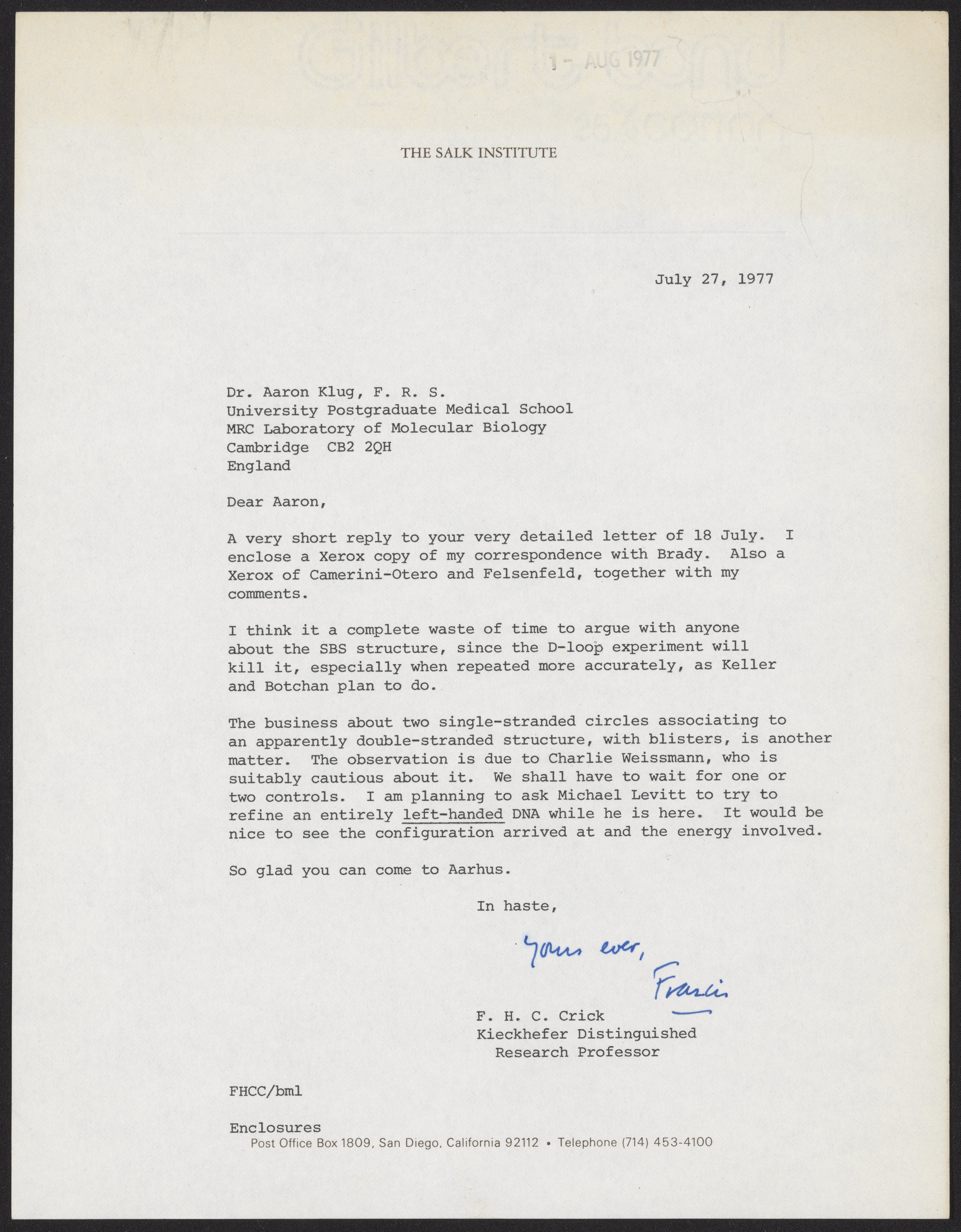 Crick, Francis. “Letter from Francis Crick to Aaron Klug, July 27, 1977,” July 27, 1977. History of Molecular Biology Collection, Box 20, Folder 1. Science History Institute. Philadelphia. https://digital.sciencehistory.org/works/5rafmi4.