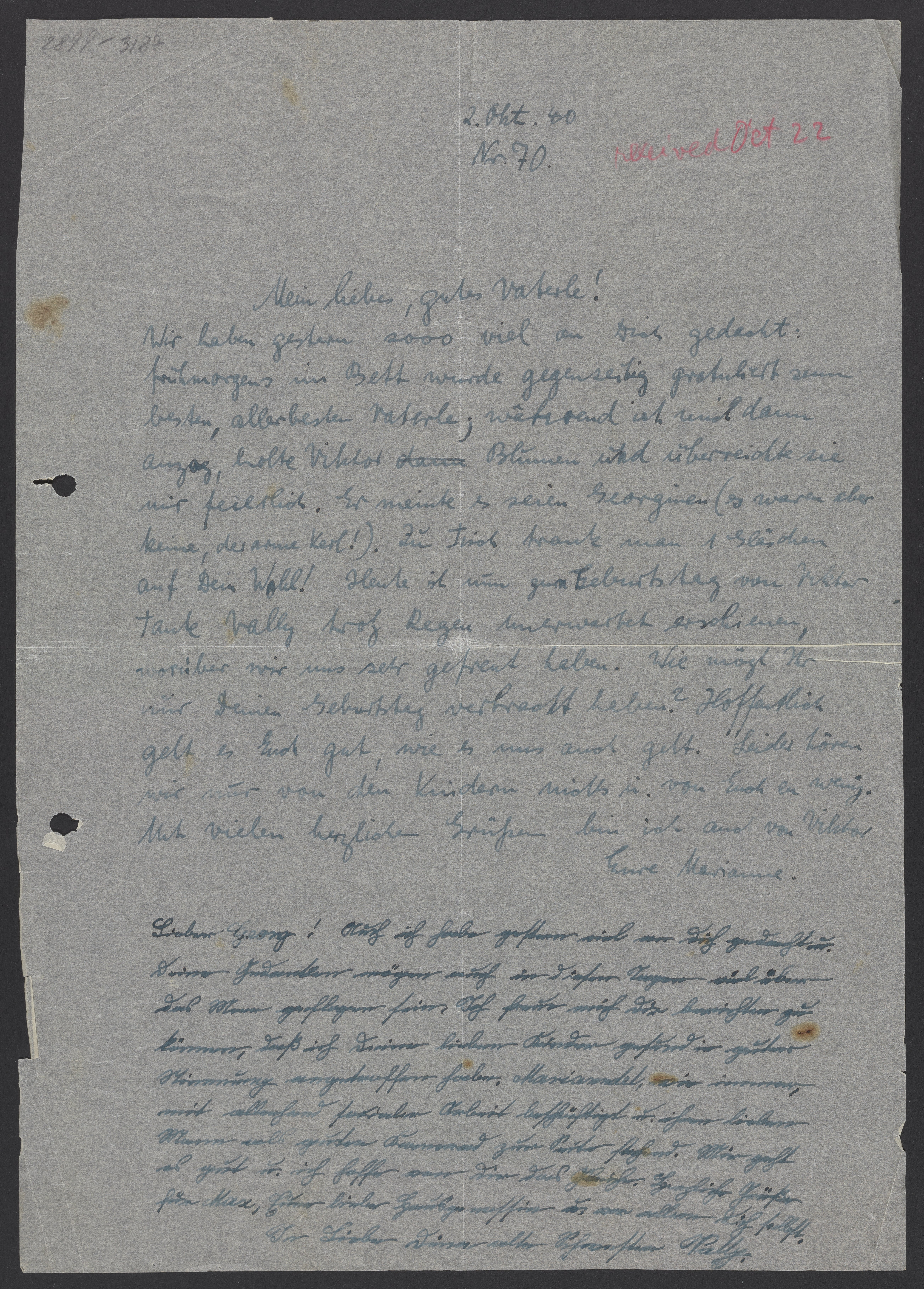 Wir haben gestern so viel an Dich gedacht: frühmorgens im Bett wurde gegenseitig gratuliert zum besten, allerbesten Vaterle; während ich mich dann anzog, holte Viktor Blumen und überreichte sie mir feierlich. Er meinte es seien Georgien (es aber keine, der arme Kerl!) Zu Tisch trank man 1 Gläschen auf dein Wohl! Heute ist nun zum Geburtstag von Viktor. Tante Valley (ist) trotz Regen unerwartet erschienen, worüber wir uns sehr gefreut haben? Wie mögt Ihr nur Deinen Geburtstag verbracht haben? Hoffentlich geht es Euch gut, wie es uns auch geht. Leider hören wir nur von den Kindern nichts u. von Euch zu wenig. Mit vielen herzlichen Grüßen bin ich und auch von Viktor