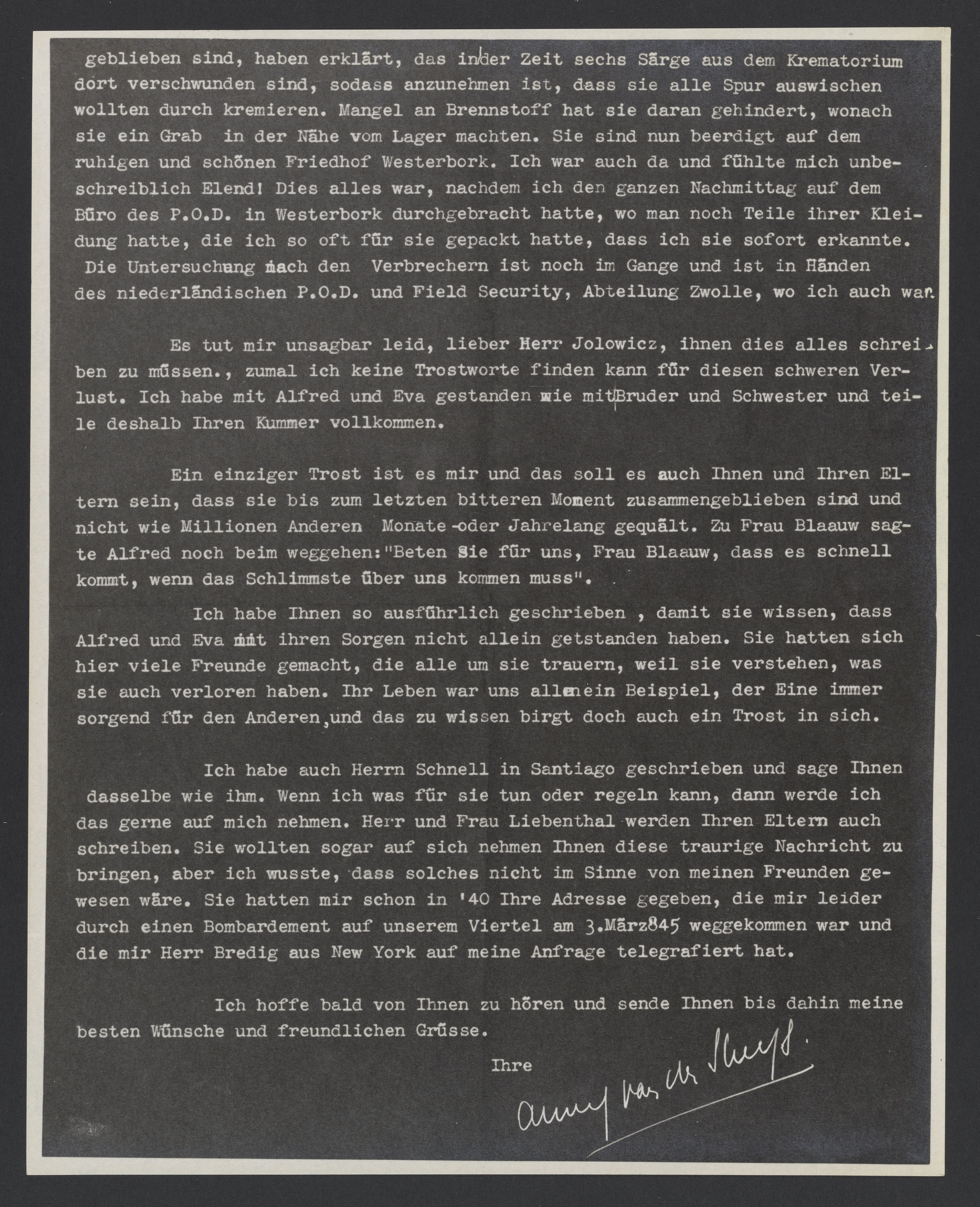 Es tut mir leid für Sie und besonders für Ihre Eltern, dass Sie die tragische Nachricht über Alfred und Eva durch ein Telegramm erfahren mussten. Ich hätte Ihnen das gerne erspart, aber meine Freundin Cilia Loots hatte das Telegramm schon abgesandt. Vielleicht hat sie auch Recht gehabt, denn ich selbst habe mehr als sieben Monate in Unsicherheit über ihr Los gelebt und weiss was das bedeutet. Damit Sie einigermassen im Bilde sind über mein Verhältnis zu Ihrer Schwester und Alfred muss ich Ihnen erzählen, dass ich Eva damals kennen gelernt habe als sie nach Holland kam bei der Familie Liebenthal, mit ich sehr befreundet war. Als sie nach ihrer Heirat in der Riouwstr. wohnte habe ich sie öfters besucht. Eine tiefe Freundschaft zwischen uns ist aber erst entstanden, als sie in '40 von den Haag weg mussten. Es wurde Ihnen dann keine Zeit gelassen ihre Sachen zu packen und ich habe ihre ganzen Sachen gepackt und nachgeschickt. Auch in Amersfoort besuchte ich sie oft. Vielleicht haben sie Ihnen mal davon erzählt. Weil ich annehme, dass es Sie interessiert, was hier alles vorgegangen ist in den letzten Jahren, will ich es Ihnen genau berichten, wie ich es auch Alfreds Bruder in Santiago getan habe.
