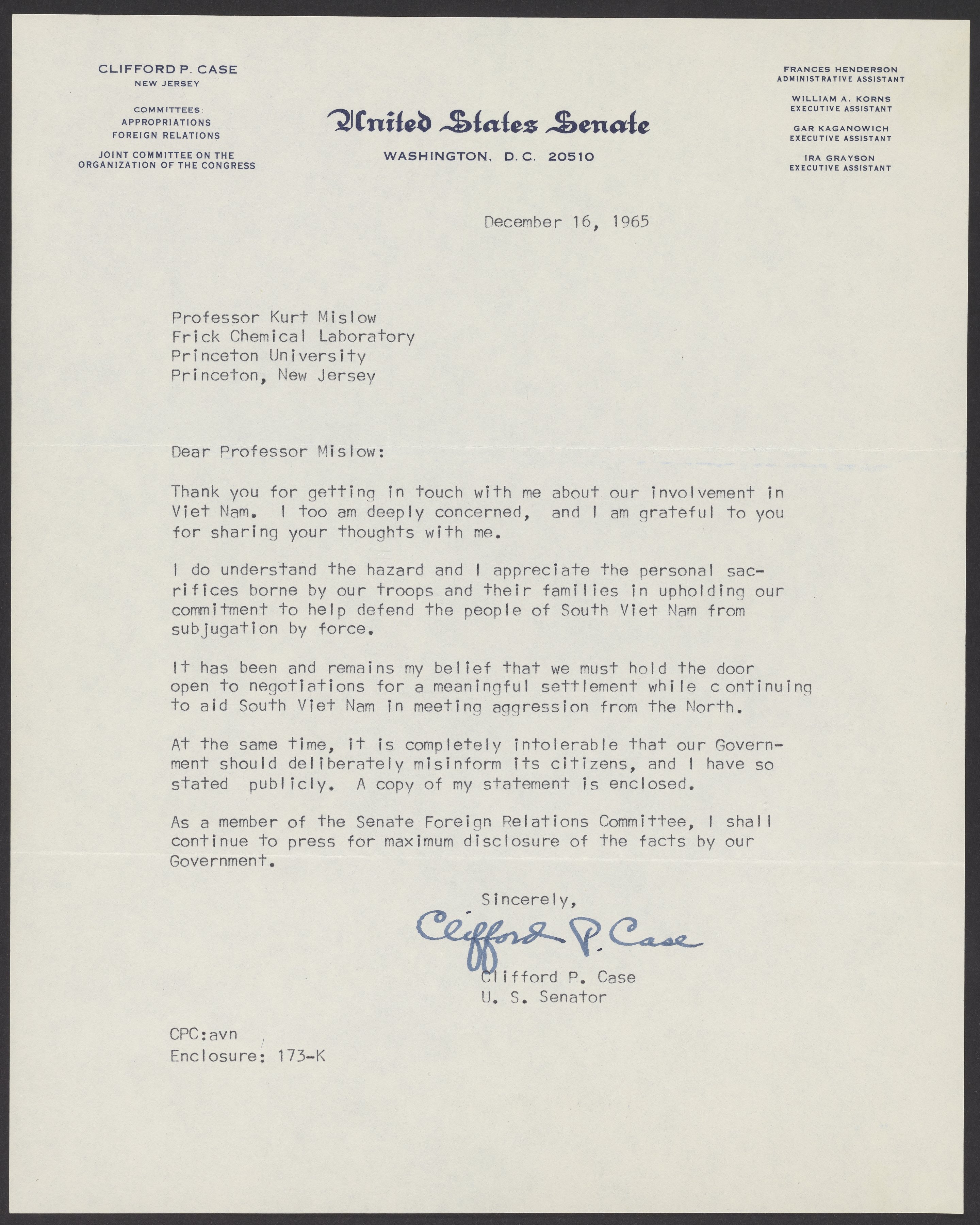 Letter from Senator Clifford P. Case (1904-1982) to Kurt M. Mislow (1923-2017). Case responds to a previous letter Mislow had written about his thoughts on the Vietnam War.