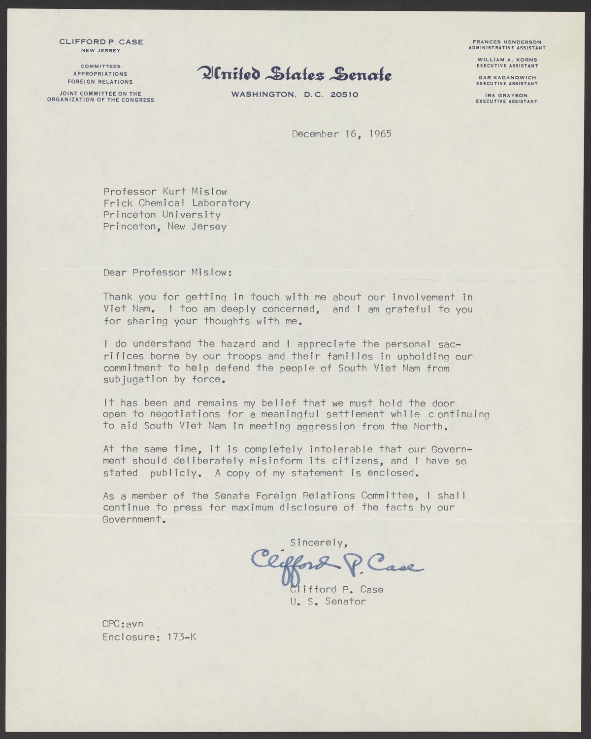 Letter from Clifford P. Case to Kurt M. Mislow, December 16, 1965