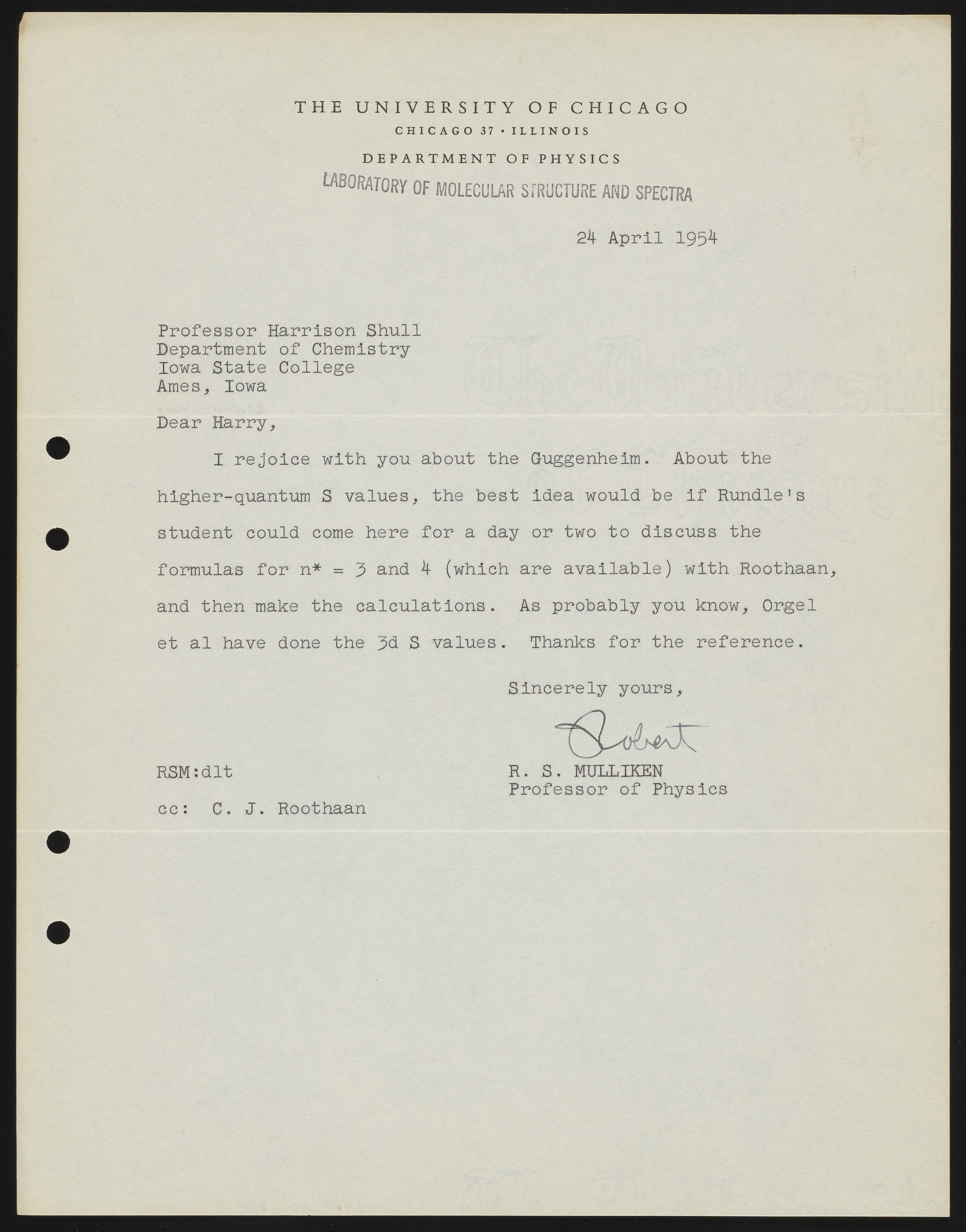 Letter from Robert S. Mulliken to Harrison Shull, 1954