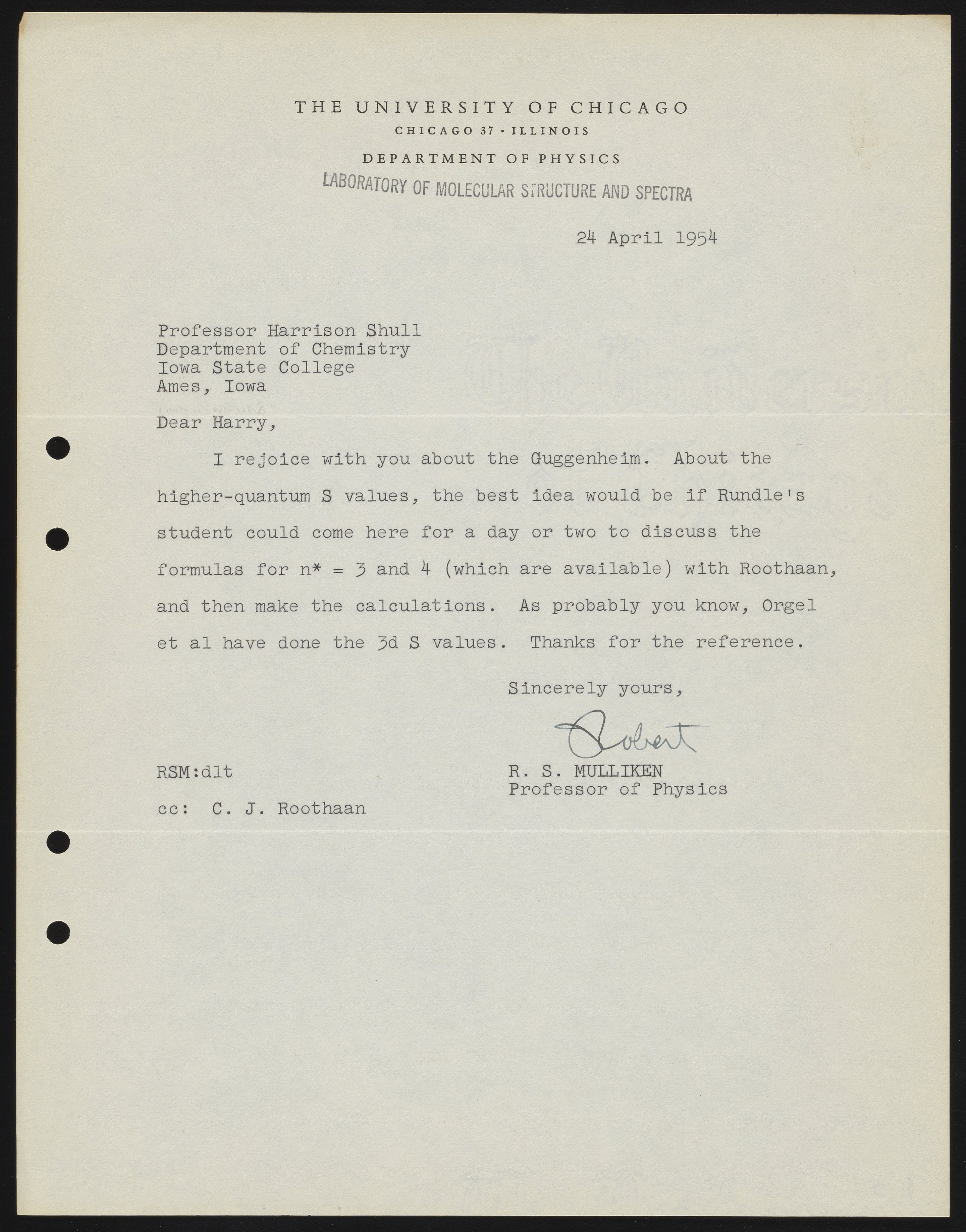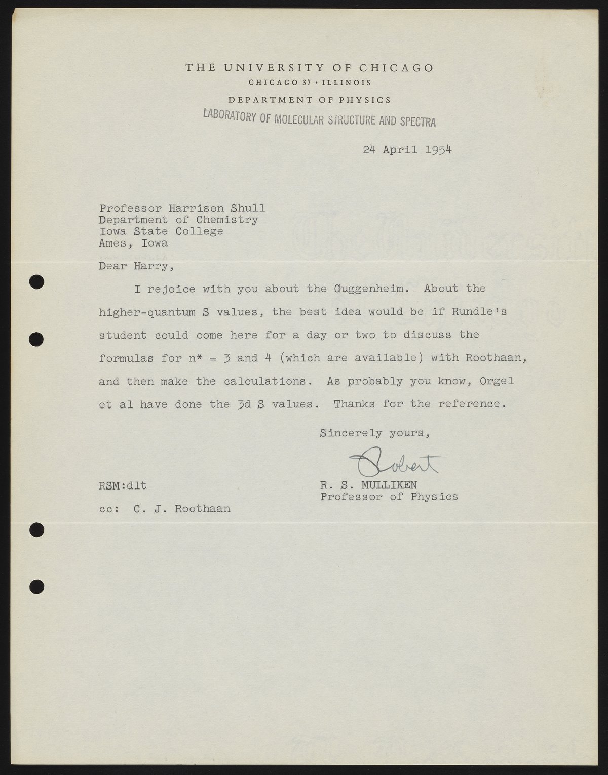 Mulliken, Robert Sanderson. “Letter from Robert S. Mulliken to Harrison Shull, 1954,” April 24, 1954. Robert S. Mulliken & Harrison Shull Correspondence, Box 1. Science History Institute. Philadelphia. https://digital.sciencehistory.org/works/5t34sj637.