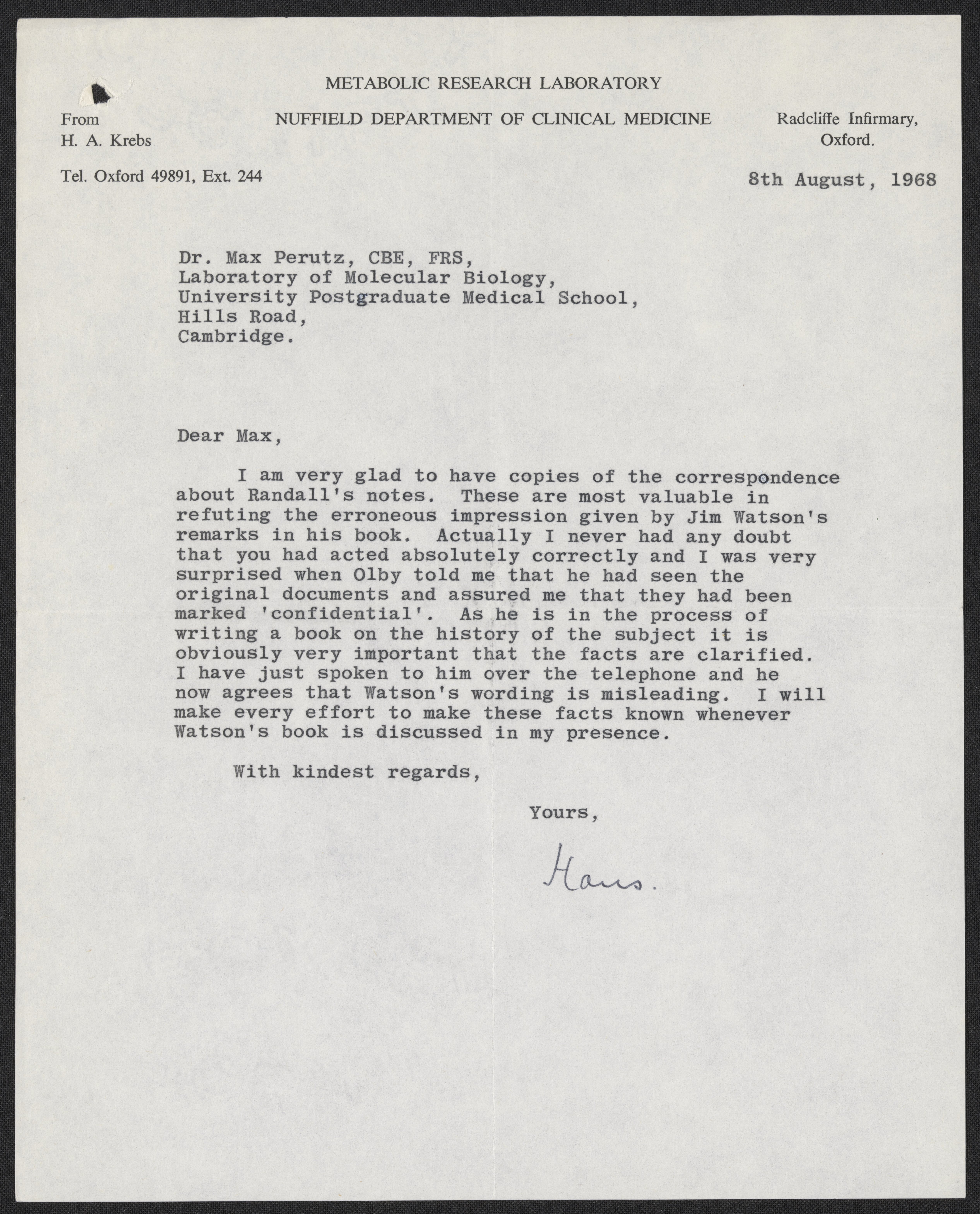 Letter from Hans A. Krebs to Max Perutz, August 8, 1968