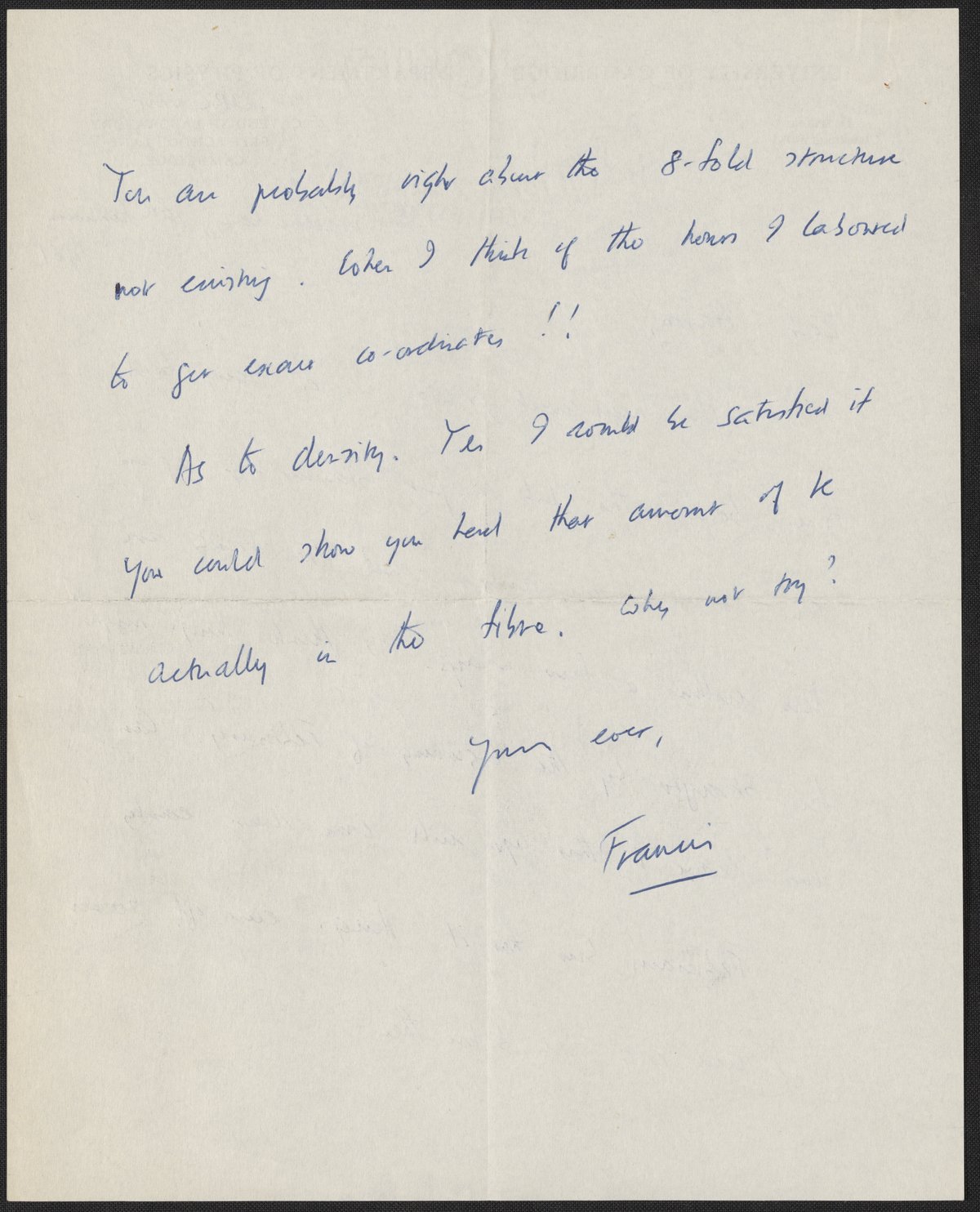 Crick, Francis. “Letter from Francis Crick to Aaron Klug, January 18, 1961,” January 18, 1961. History of Molecular Biology Collection, Box 19, Folder 20. Science History Institute. Philadelphia. https://digital.sciencehistory.org/works/5vblg40.