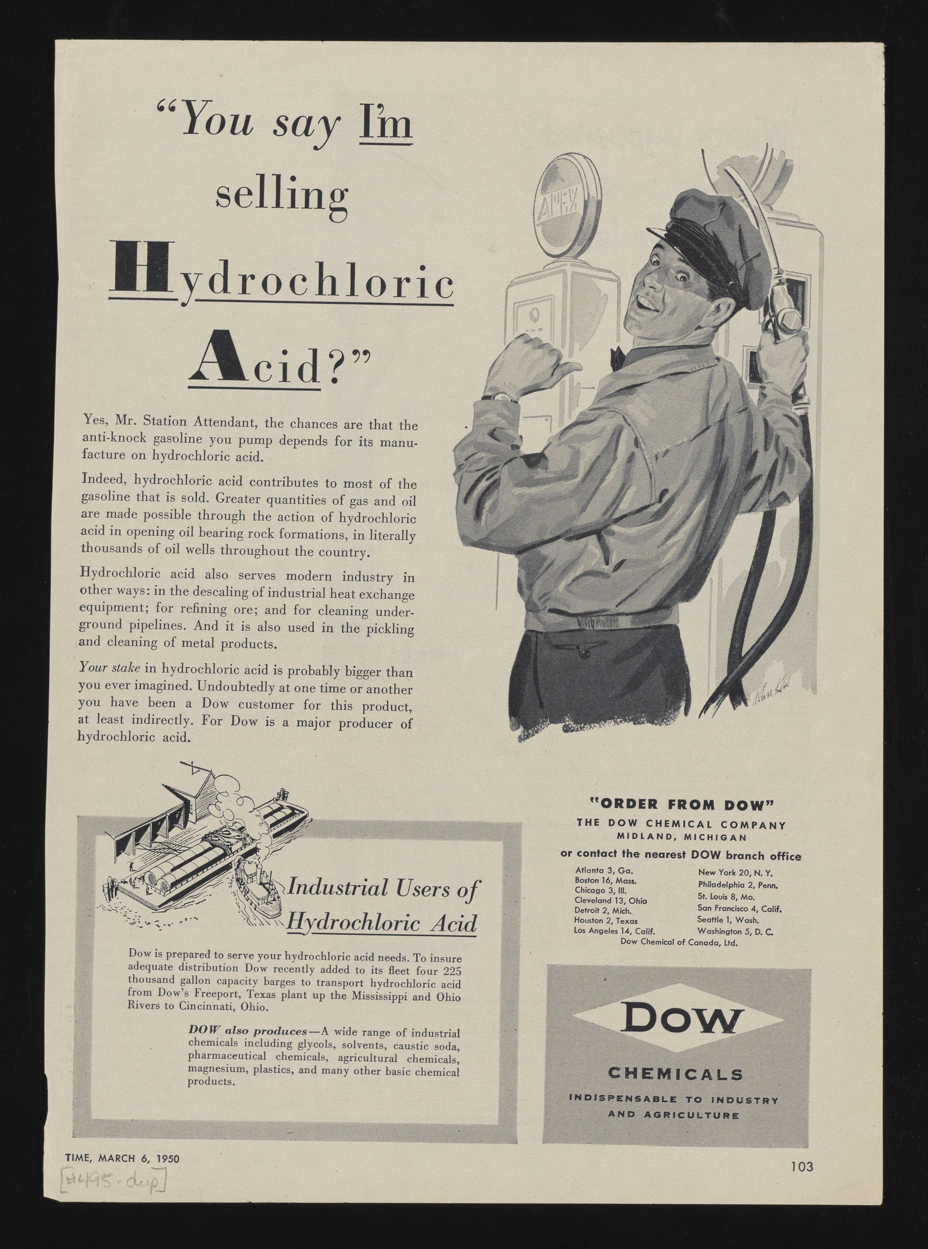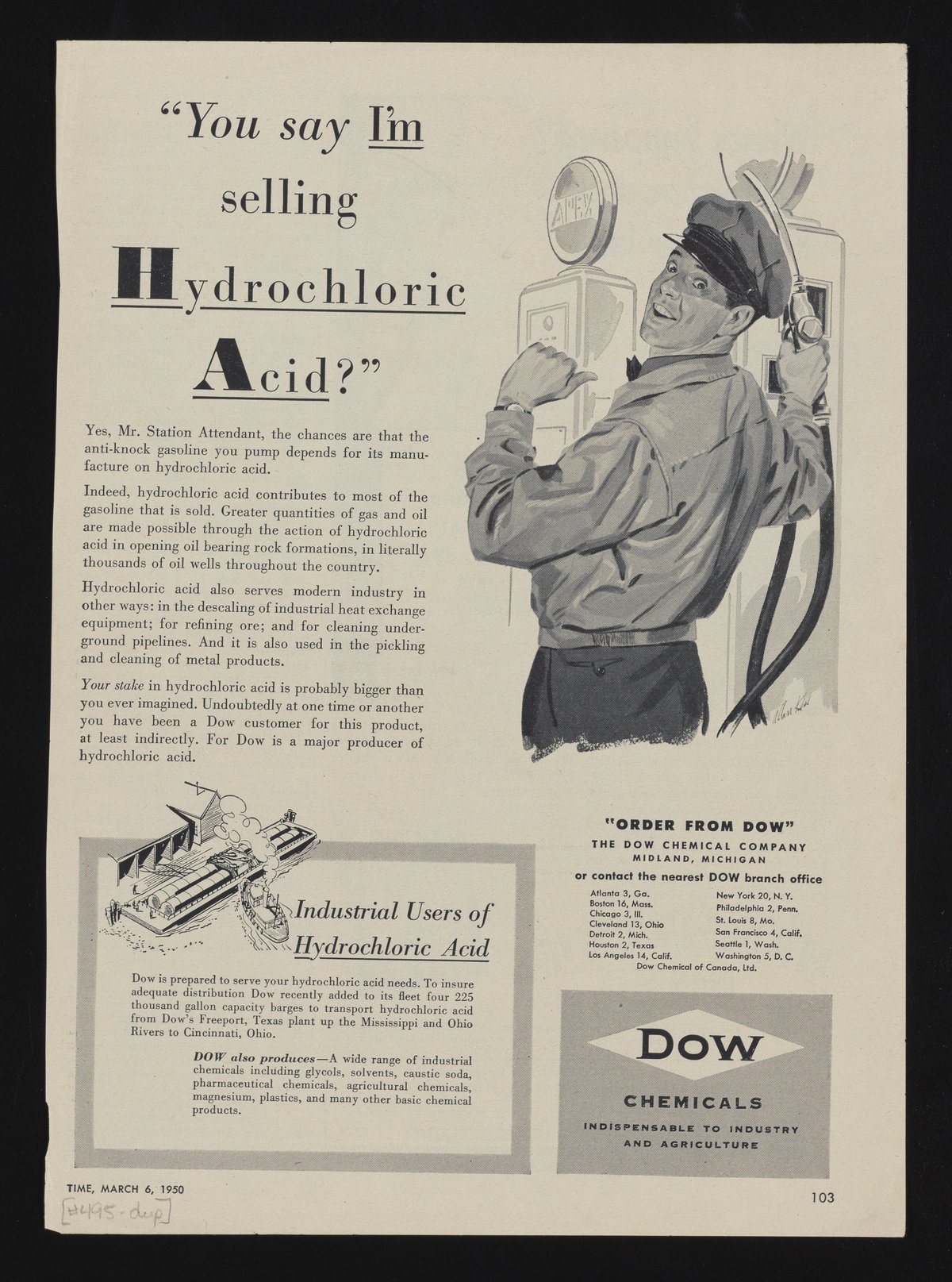Dow Chemical Company. “You Say I'm Selling Hydrochloric Acid?,” March 20, 1950. Advertisements from the Dow Chemical Historical Collection, Box 8. Science History Institute. Philadelphia. https://digital.sciencehistory.org/works/5vcxic9.