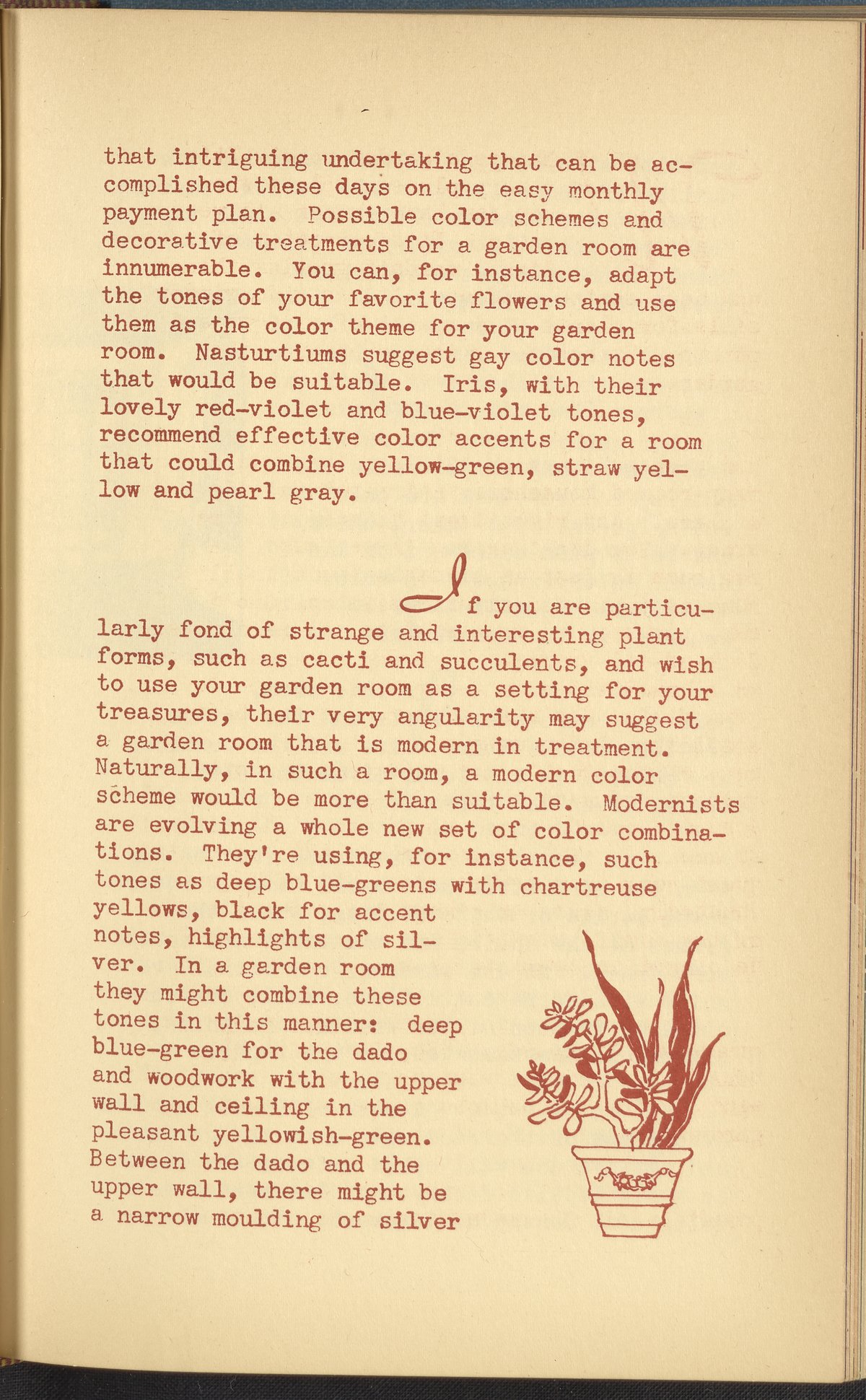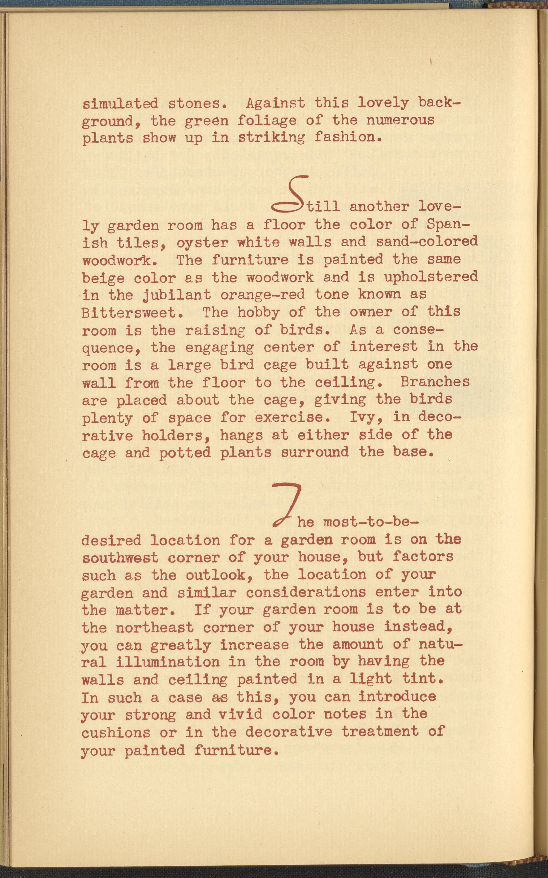 Booklet corresponding to a radio broadcast program created by the National Paint, Varnish, and Lacquer Association. The booklet discusses creating a garden room or sunroom for one's home. Describes possible color schemes and decorative treatments for inspiration. Includes small stylized illustrations throughout and decorated covers.