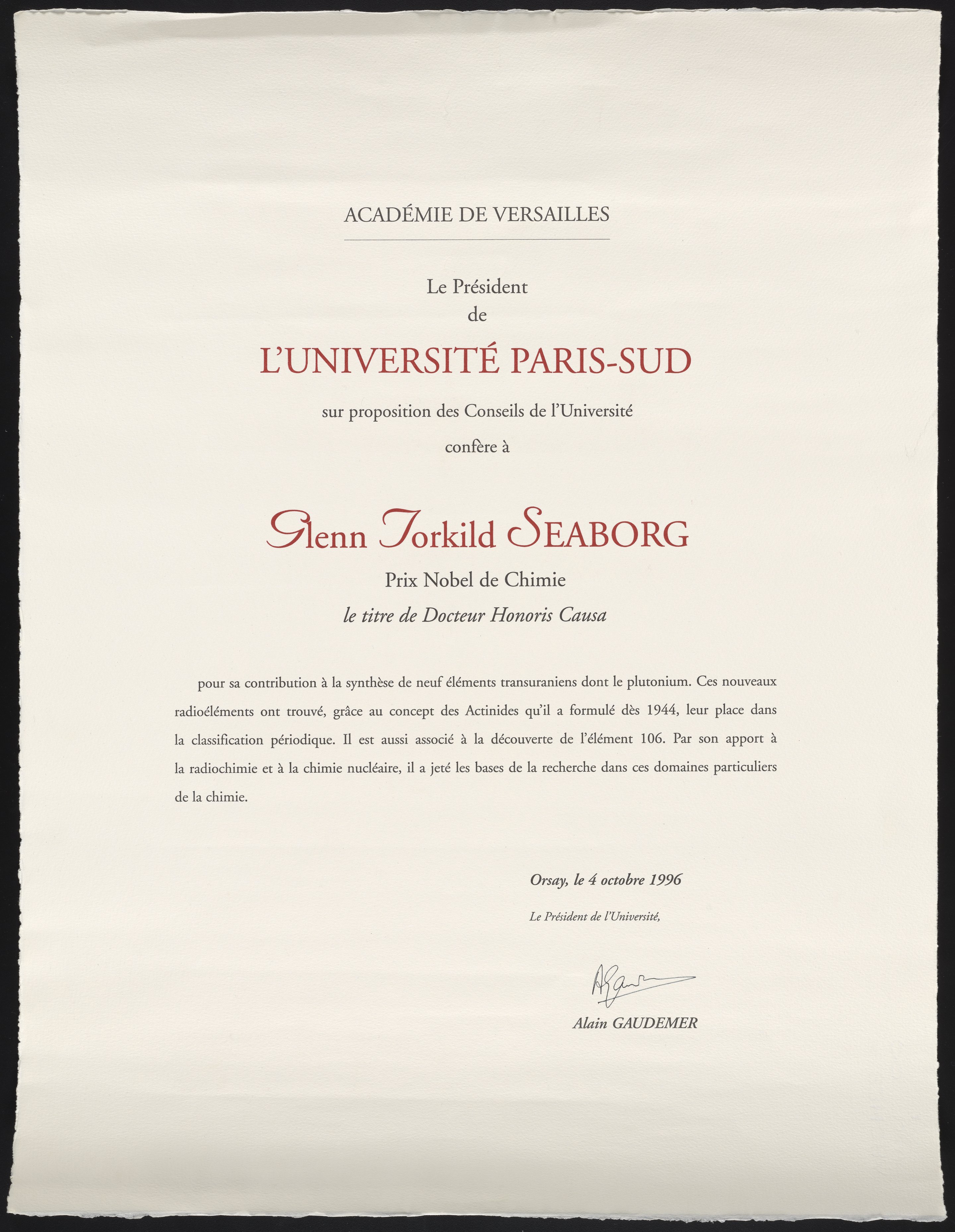 Université de Paris. “Honorary Degree to Glenn Seaborg from the University of Paris-Sud,” October 4, 1996. Records of the Lawrence Berkeley National Laboratory - Nuclear Division, Folder 2. Science History Institute. Philadelphia. https://digital.sciencehistory.org/works/5x21tf46t.