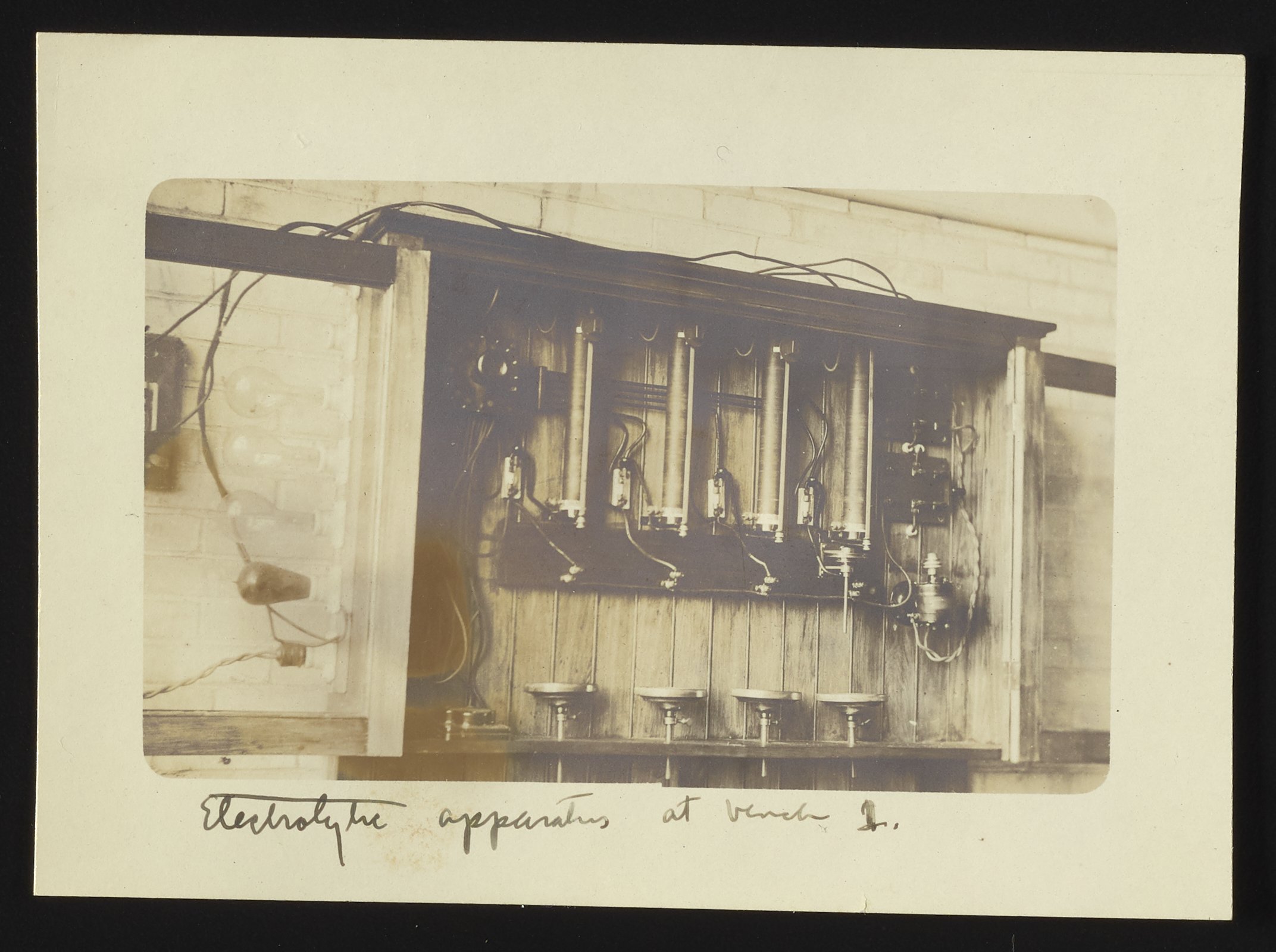 Close-up view of an electrolytic apparatus at a laboratory work bench attributed to the U.S. Bureau of Standards. Notably, the photograph is printed as a postcard, with space reserved on the verso for a message, mailing address, and postage. While the setting of this photograph is unidentified, inscriptions and supporting materials suggest that it many depict a laboratory associated with the U.S. Bureau of Standards. However, there is no contextual information directly linking this photo to the Bureau of Standards, which broadly conducted tests on a variety of physical materials, developed a range of technological standards, and supported the dissemination of scientific and technological information.