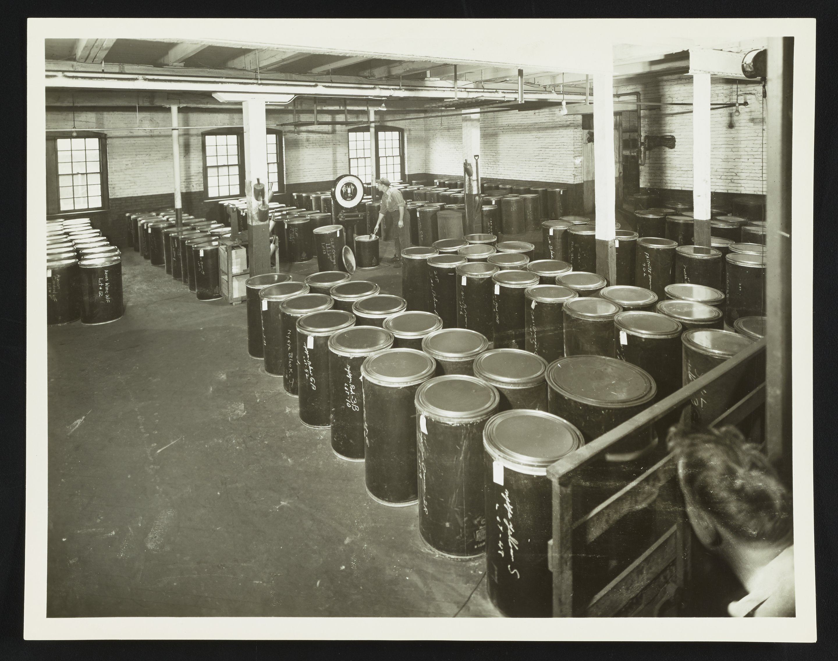 General view of the shipping and storage room at the Althouse Chemical Company manufacturing plant in Reading, Pennsylvania. Several rows of drums containing dyestuffs prepared for shipment fill the room. Various dye colors and lots numbers are visible on the sides of the drums. Employee Paul Leinbach is seen weighing the contents of a drum, presumably to determine the correct amount of dyestuffs.