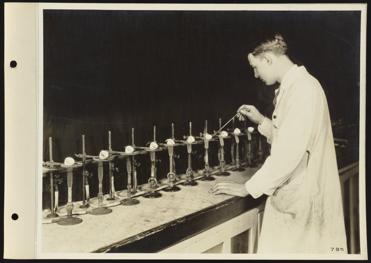 General view of an unidentified employee analyzing unidentified substances at the Dearborn Chemical Company's 35th Street laboratory facility and manufacturing plant. A row of Bunsen burners are visible on the work bench. Founded in 1887, the Dearborn Chemical Company was a corporate ancestor of BetzDearborn, Incorporated best known for manufacturing water treatment chemicals for use in boilers and cooling towers.