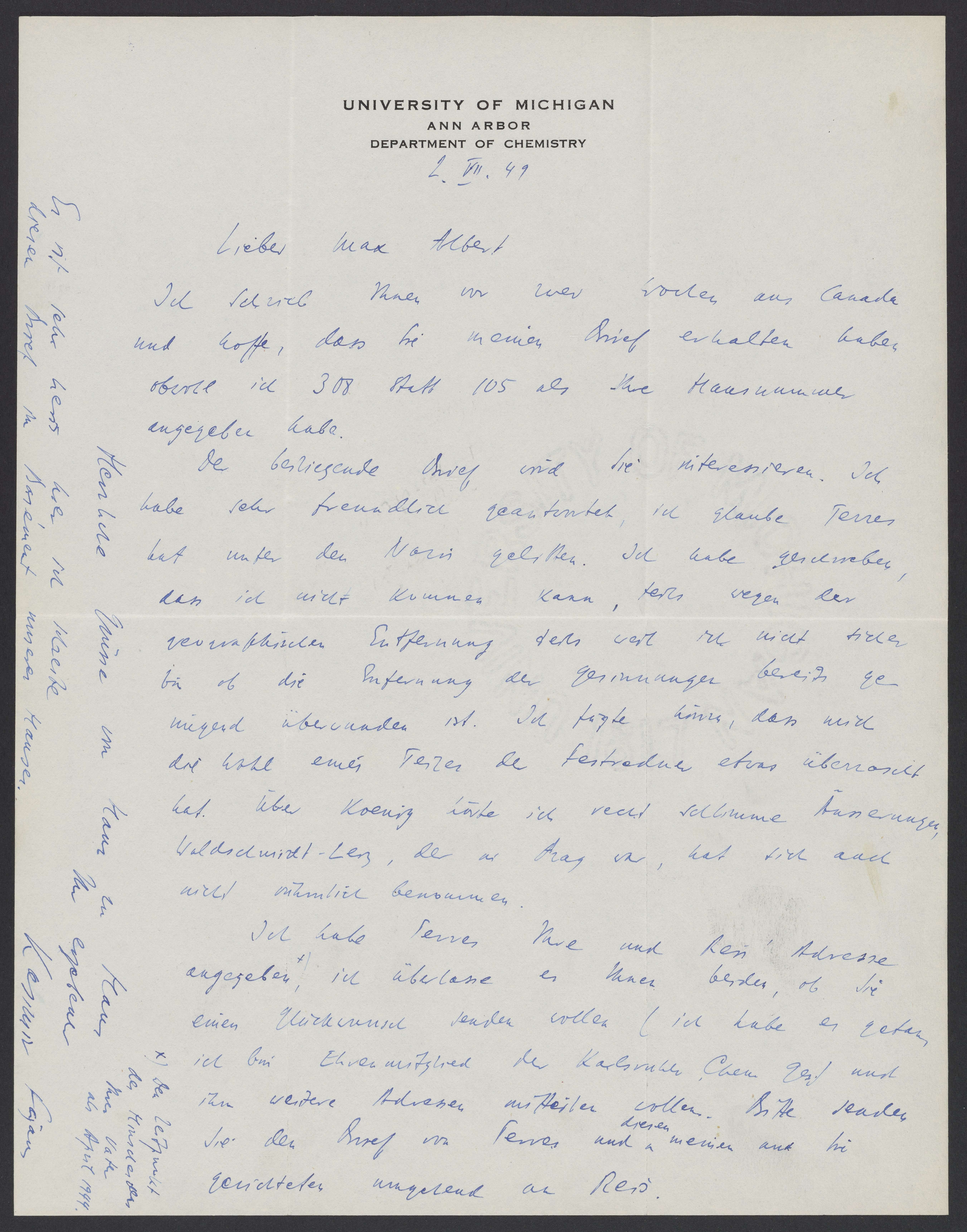 Small JPG1200 x 1529px — 246 KBLarge JPG2880 x 3668px — 1.5 MBFull-sized JPG5406 x 6885px — 5.2 MBOriginal fileTIFF — 5406 x 6885px — 107 MBA letter from Kasimir Fajans (1887-1975) to Max Albert Bredig (1902-1977) about correspondence from Ernst Terres (1887-1958) in Germany, who was inquiring about German scientists in the United States.