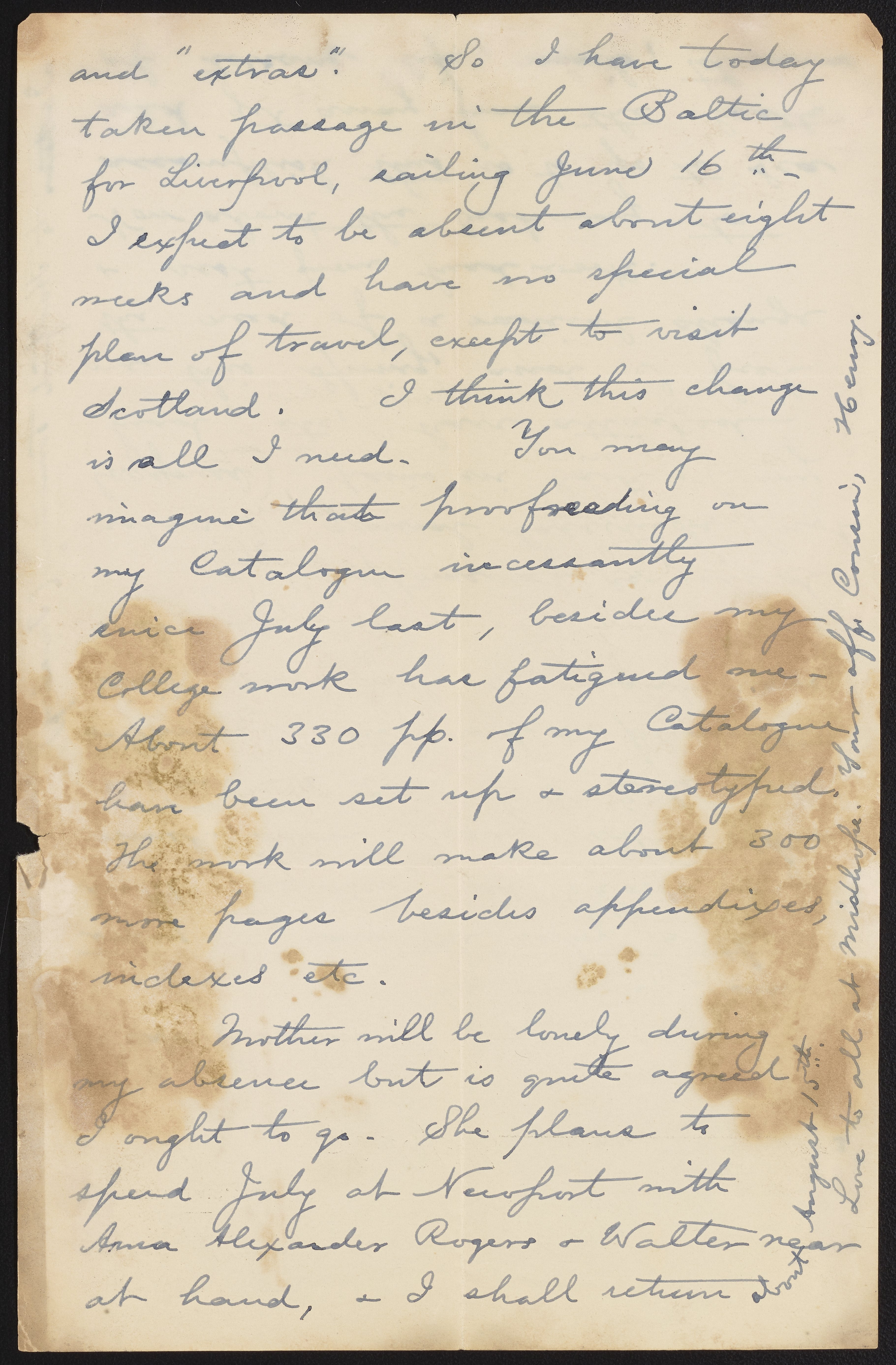 Small JPG1200 x 1813px — 350 KBLarge JPG2880 x 4352px — 1.9 MBFull-sized JPG3670 x 5546px — 2.9 MBOriginal fileTIFF — 3670 x 5546px — 58.3 MBHenry Carrington Bolton (1843-1903), an American chemist, professor of science at Trinity College, and relative of James Curtis Booth (1810-1888), writes to Booth, mentioning his fatigue from proofreading his Catalogue of Scientific and Technical Periodicals and his plans to sail for Liverpool on the S.S. Baltic with a view to seeing Scotland.