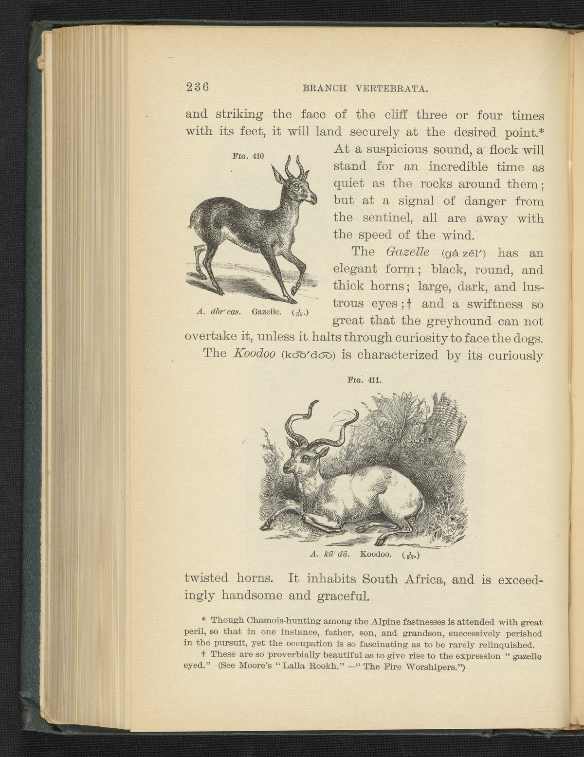 Steele, Joel Dorman, and Jenks, J. W. P. (John Whipple Potter). “Figure 410. Gazelle. Figure 411. Koodoo.” Popular Zoology. New York, New York: Chautauqua Press, 1887. https://digital.sciencehistory.org/works/6336krj.