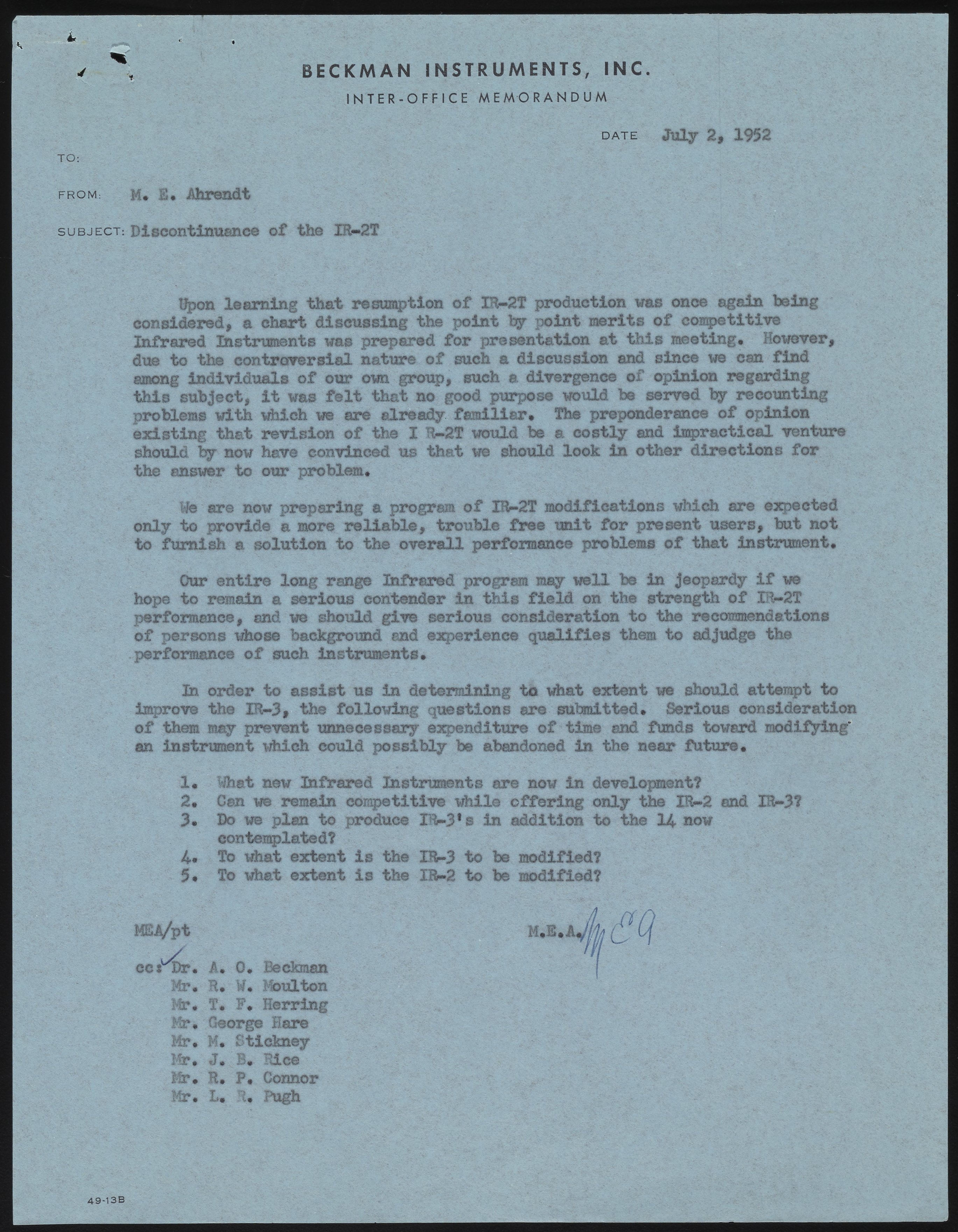 Memo from M. E. Ahrendt to Beckman Instruments staff