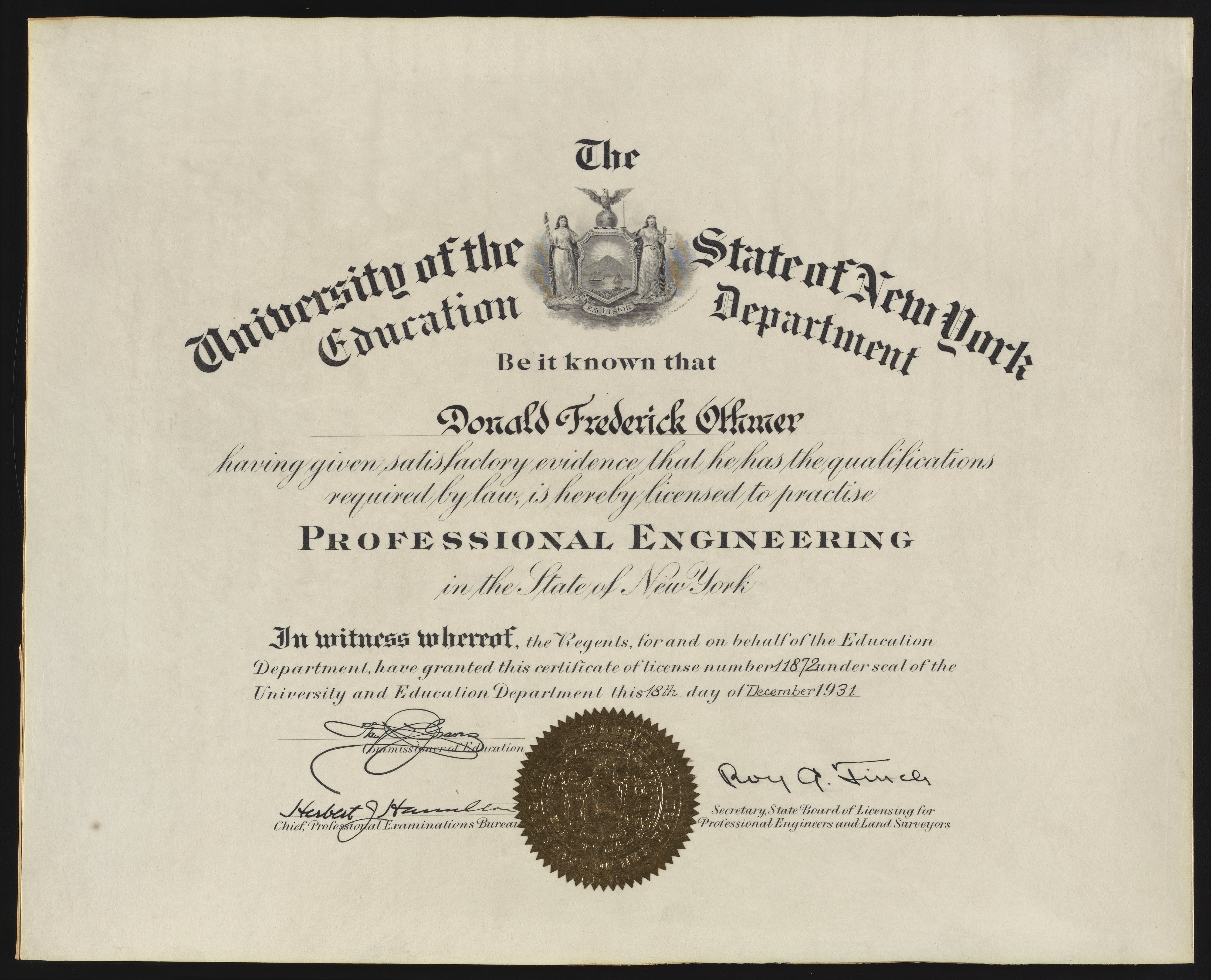 University of the State of New York. “Certificate Licensing Donald F. Othmer as a Professional Engineer in the State of New York,” December 18, 1931. Donald F. Othmer Papers, Folder 1. Science History Institute. Philadelphia. https://digital.sciencehistory.org/works/6395w715k.