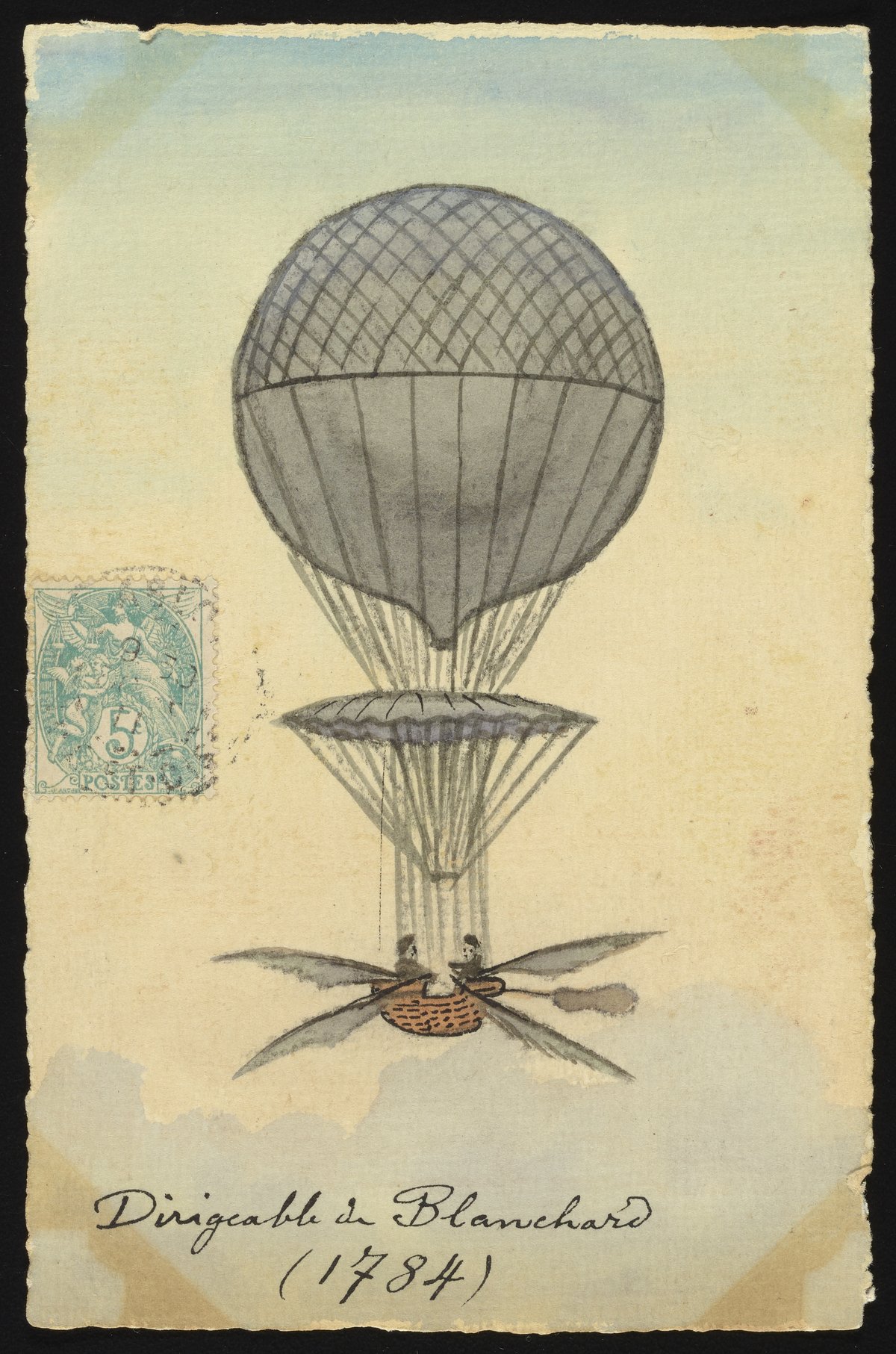 Postcard featuring a hand-drawn illustrated depiction of a flying airship with oars. The illustration depicts a type of airship with oar-like propulsion mechanisms designed and flown by French balloonist Jean-Pierre Blanchard (1753-1809) in 1784. This postcard is part of a set originally collected in a scrapbook entitled Album Gravures et Cartes-Postales: Vieux Paris Types Petits Métiers et Cris De La Rue (1909).