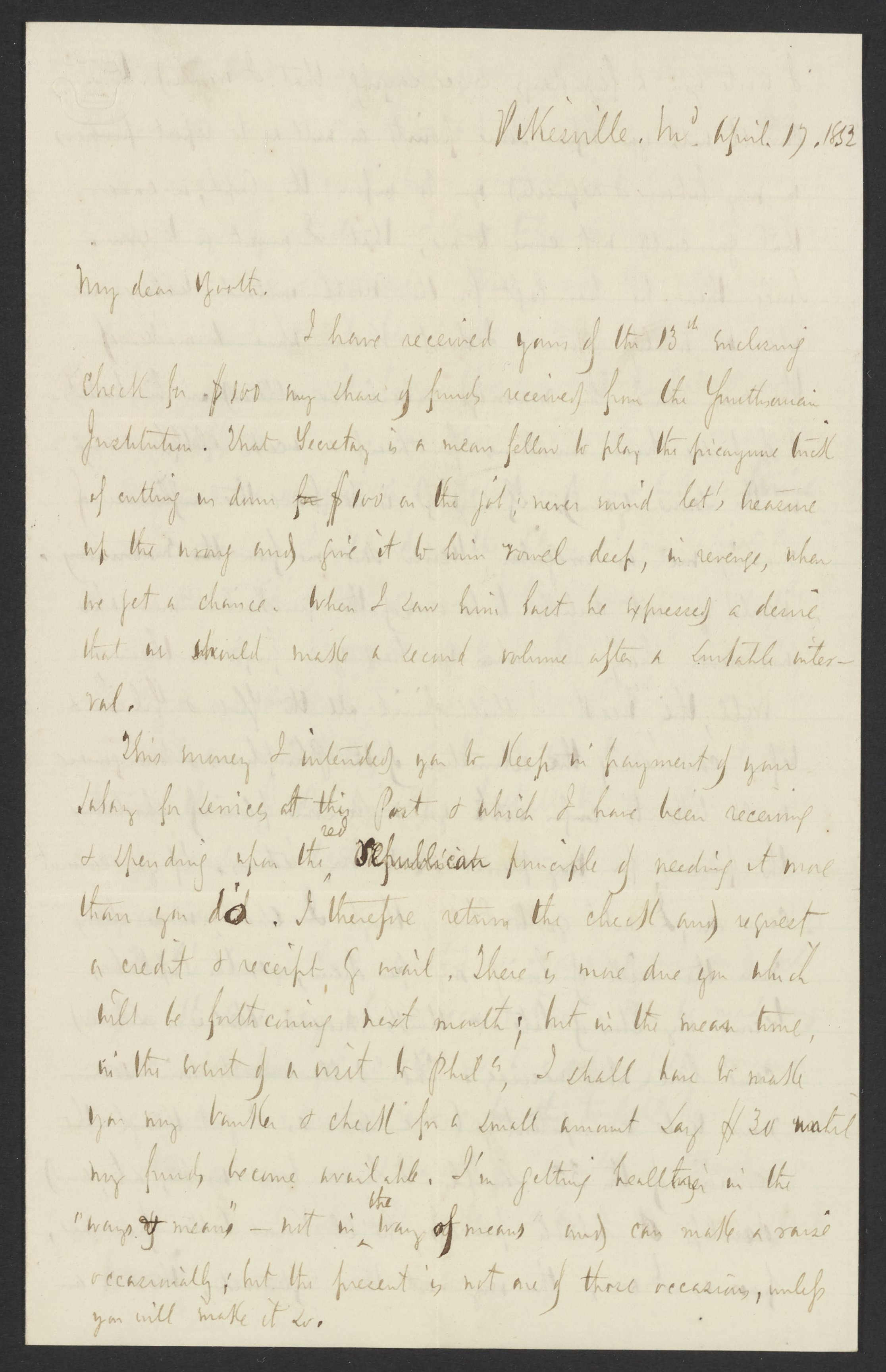 Letter from Campbell Morfit to James Curtis Booth, April 17, 1852